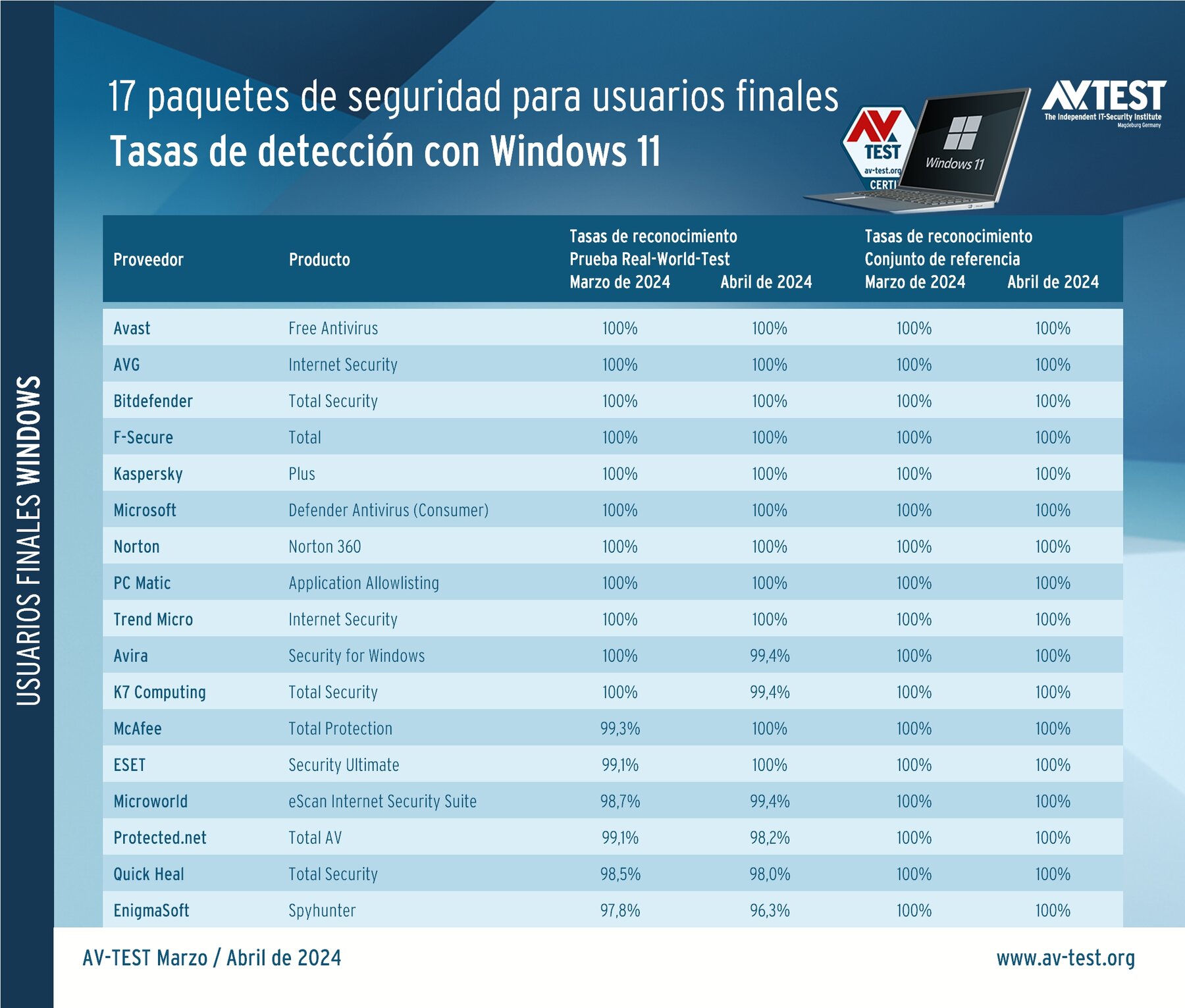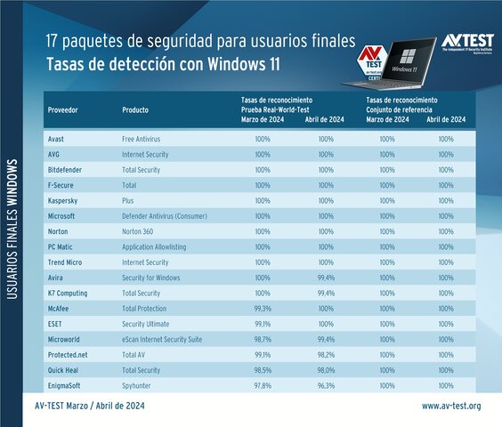 En la prueba actual realizada en marzo y abril de 2024 con Windows 11 como plataforma de pruebas participaron los siguientes 17 fabricantes: Avast, AVG, Avira, Bitdefender, EnigmaSoft, ESET, F-Secure, K7 Computing, Kaspersky, McAfee, Microsoft, Microworld, Norton, PC Matic, Protected.net, Quick Heal y Trend Micro. En las pruebas siempre se utilizan las versiones más actuales de los productos disponibles para el público. Dichas versiones se pueden actualizar en línea en todo momento, así como hacer uso de sus servicios en la nube.