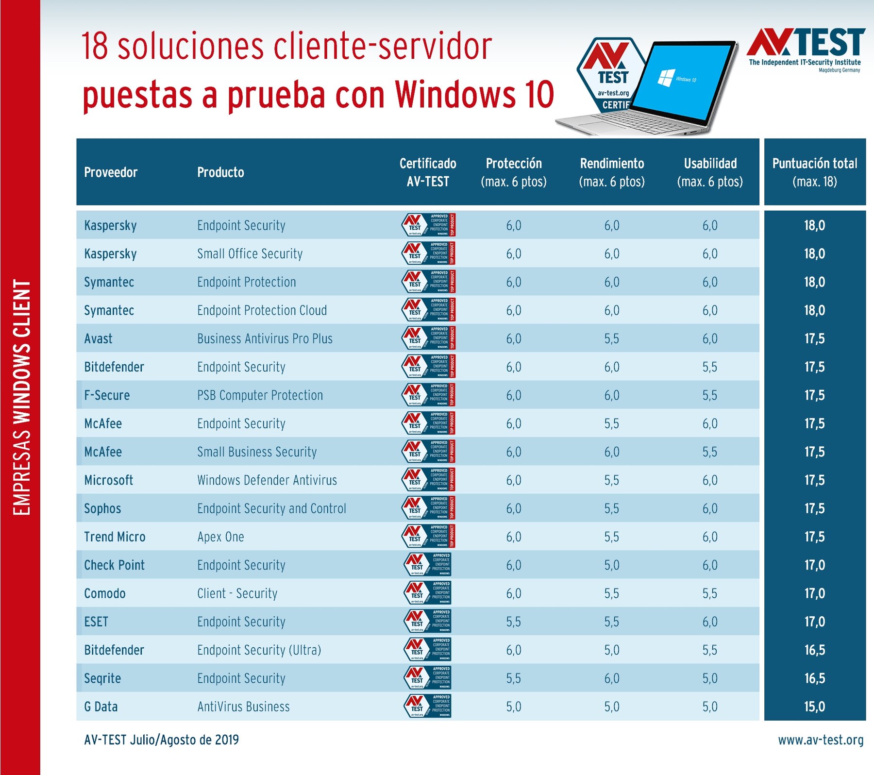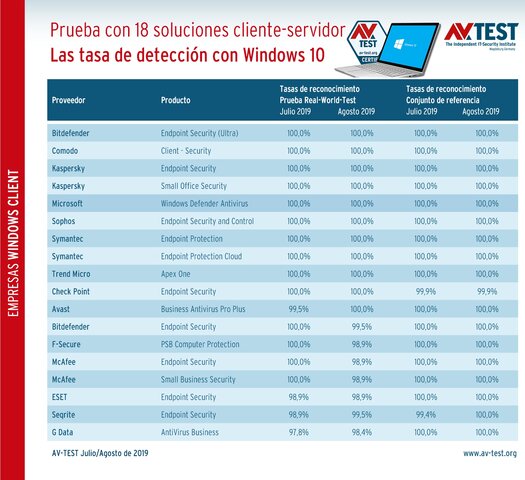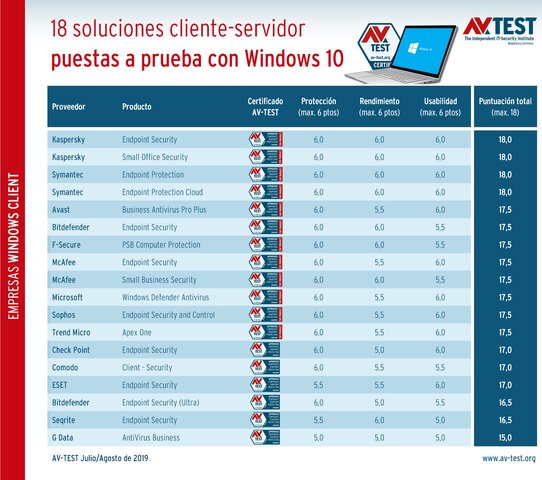 El resultado de la prueba muestra que el mercado ya cuenta con buenas soluciones para empresas. El laboratorio otorgó 4 veces la máxima puntuación de 18 y 8 veces la elevada puntuación de 17,5. Por este extraordinario rendimiento, el laboratorio otorgó 12 veces el reconocimiento especial de PRODUCTO TOP. Las soluciones de Kaspersky y Symantec obtuvieron 18 puntos cada una con dos versiones de producto. 17,5 puntos acumularon los productos de Avast, Bitdefender, F-Secure, McAfee (con dos versiones), Microsoft, Sophos y Trend Micro.