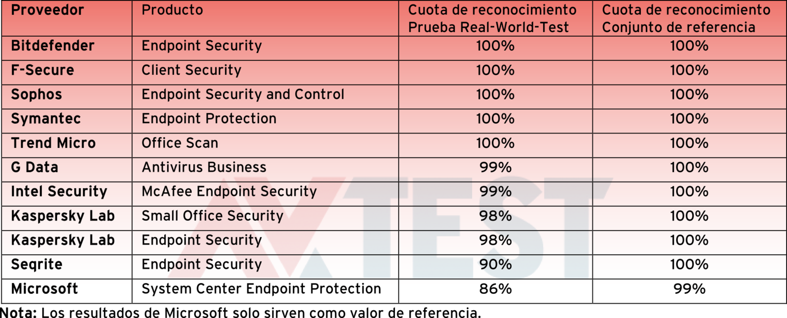 Los productos a la cabeza de esta prueba consiguieron entre 17 y 18 puntos: Bitdefender, F-Secure, Kaspersky Lab con ambas versiones, Intel Security (antigua McAfee) y Trend Micro. Si bien la máxima puntuación de 18 solo la consiguió Trend Micro.