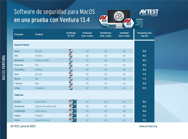 De los productos para usuarios finales, las siguientes soluciones finalizaron la prueba con una detección del 100 por cien de los programas maliciosos: Avast Security, AVG AntiVirus, Bitdefender Antivirus for Mac, Kaspersky Plus, Trend Micro Antivirus. Por ello recibieron los 6 puntos máximos.