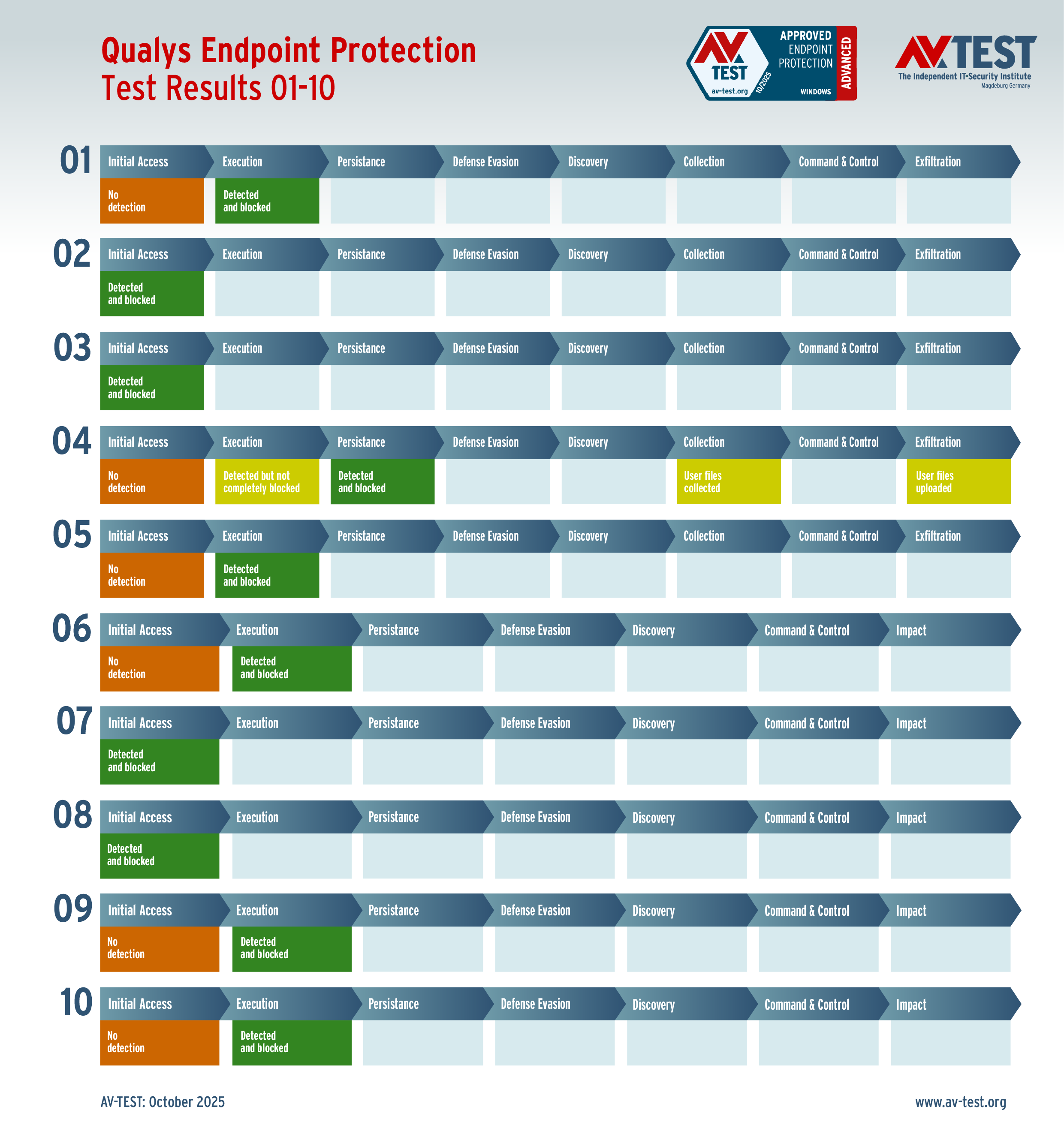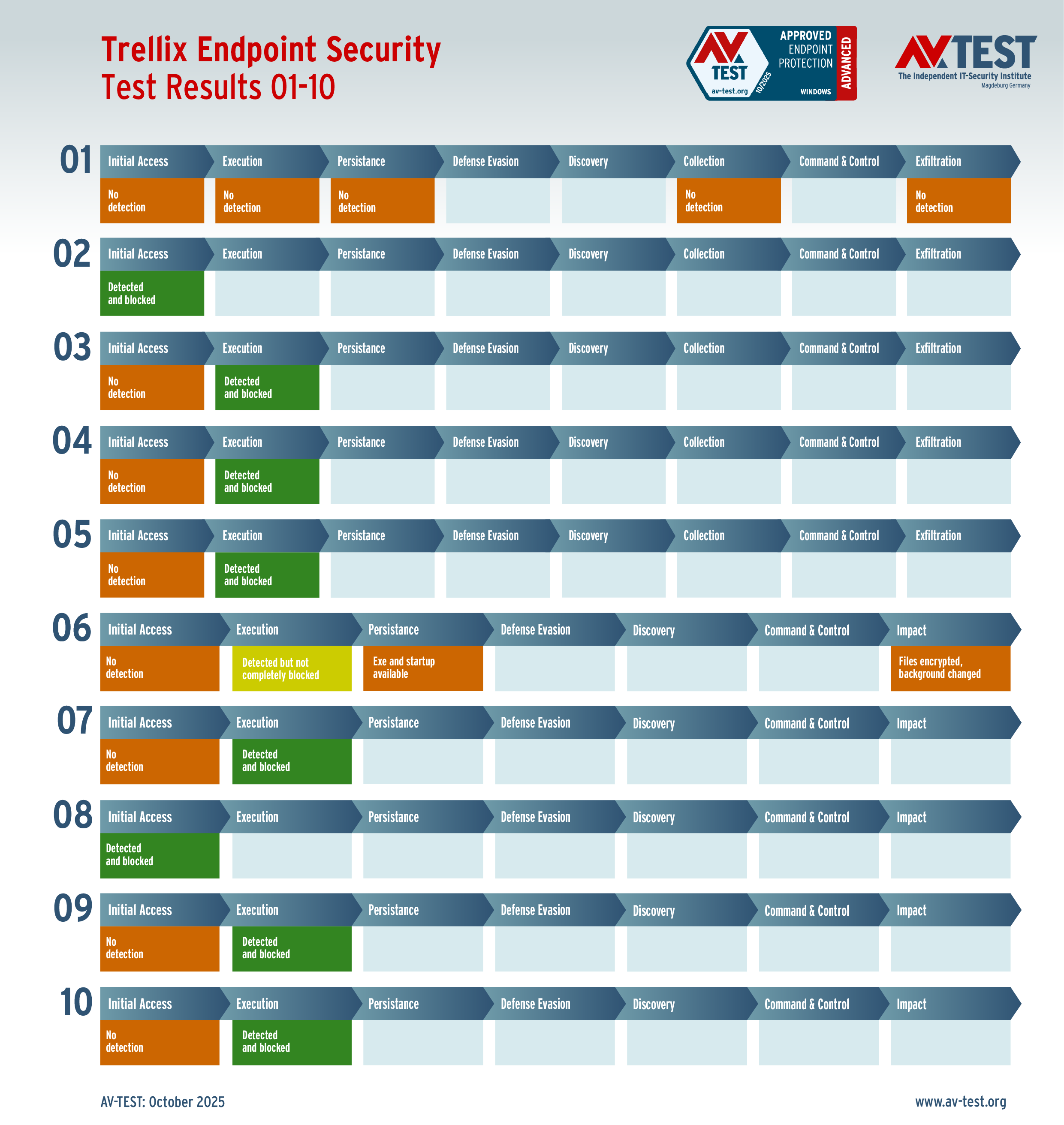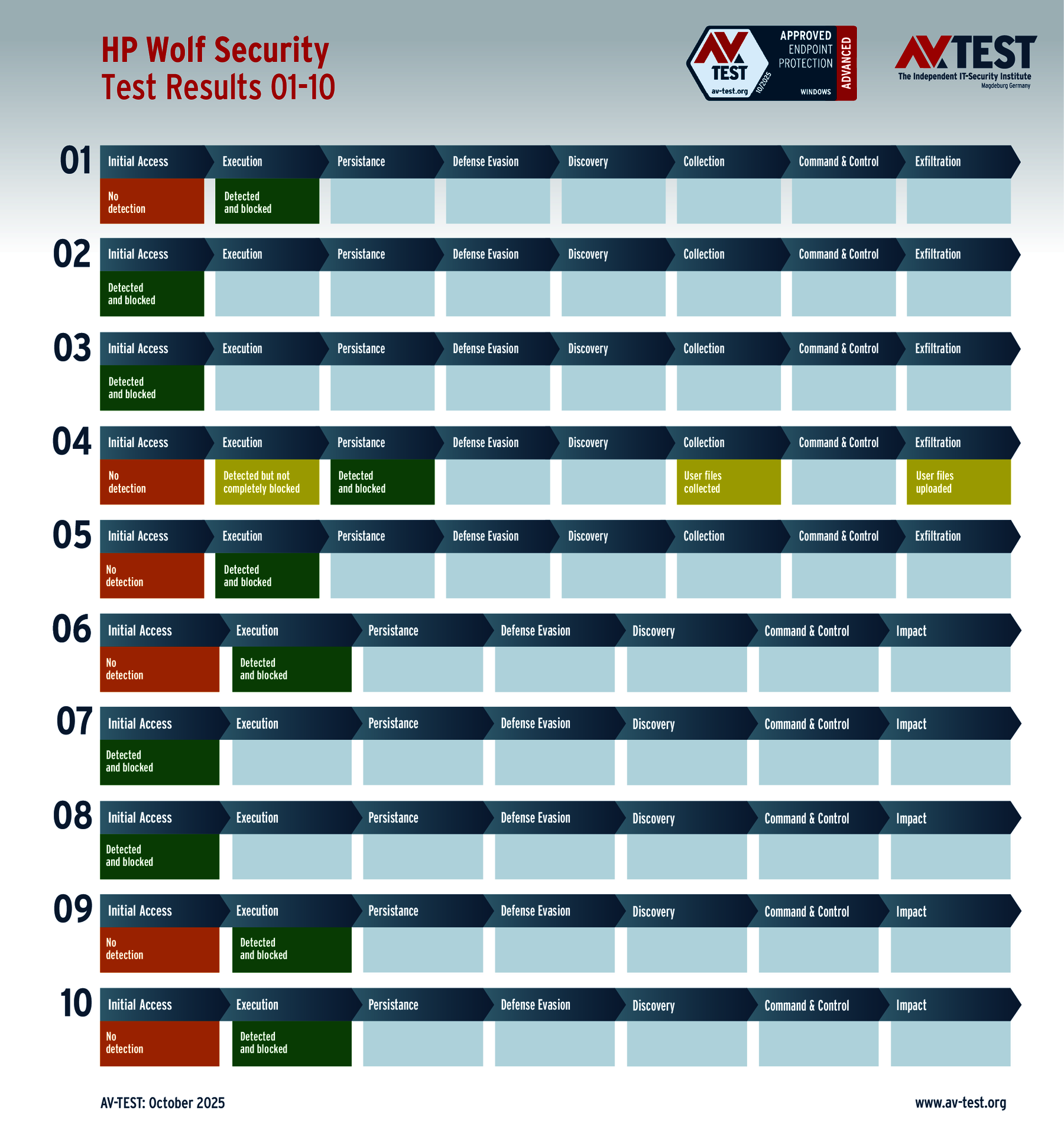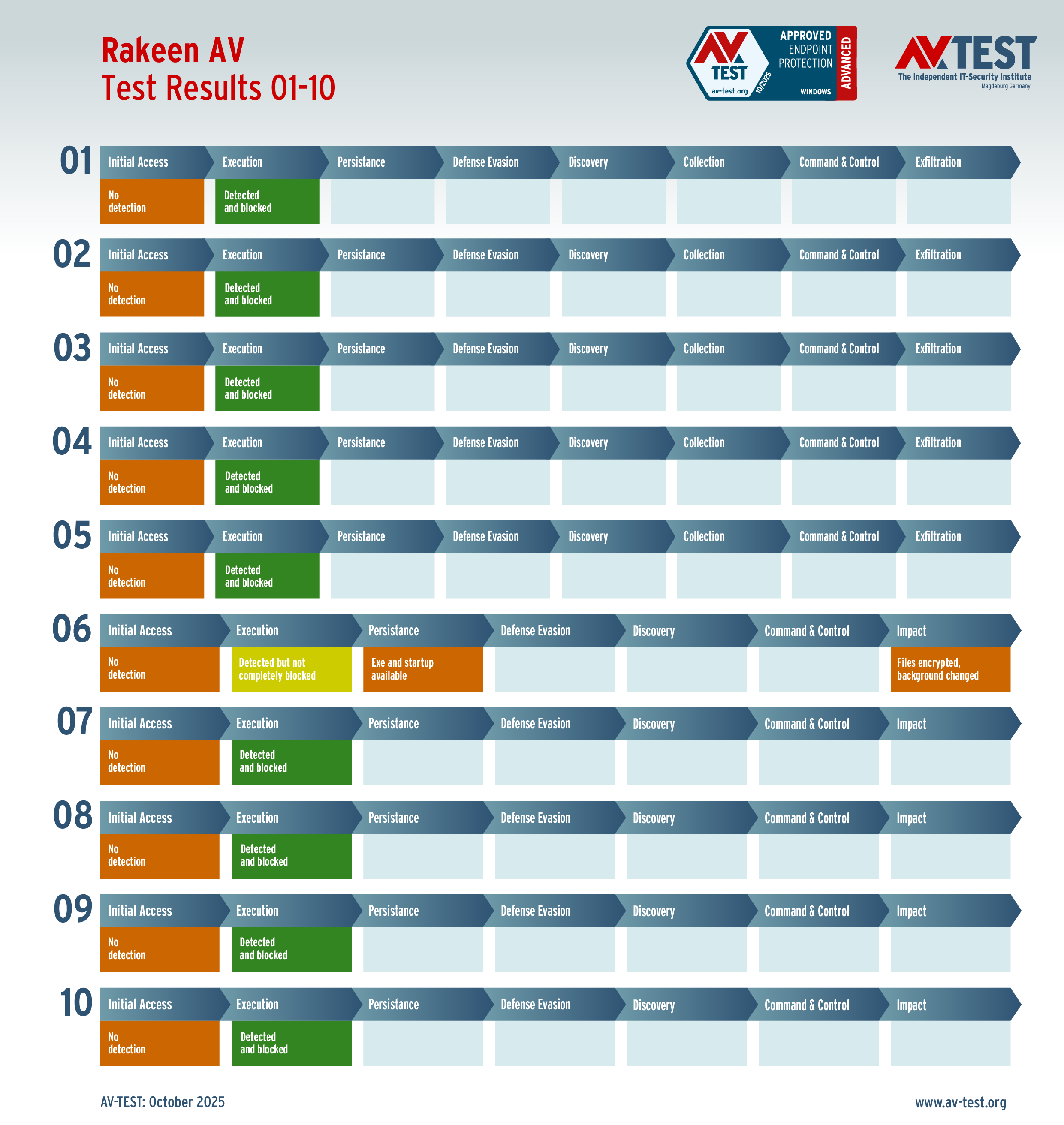El laboratorio examinó a todos los productos en 10 escenarios de ataque reales respectivamente y documentó cada paso de su defensa contra el malware. Lo interesante es que, aunque un malware no sea detectado de inmediato o durante su ejecución, sigue habiendo posibilidades de defensa mediante módulos de protección posteriores que se concatenan. De este modo es posible salvar al final un sistema, aunque en los primeros pasos el malware llevara la ventaja.