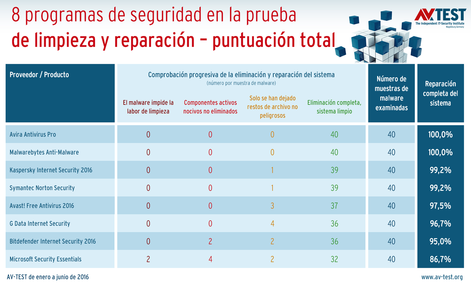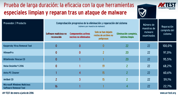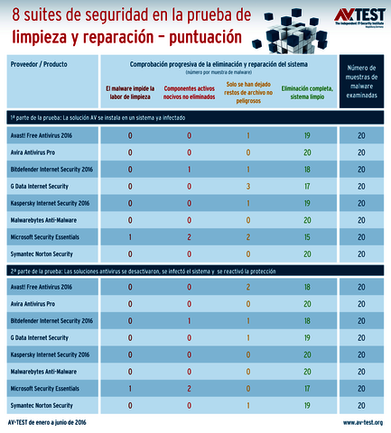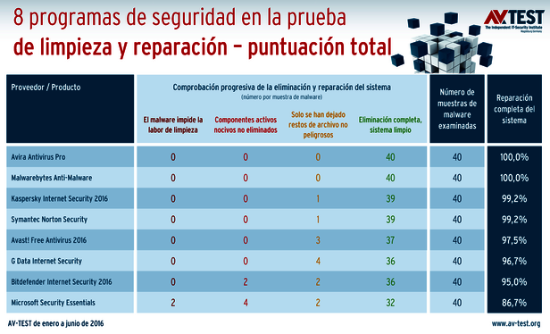 6 de 8 paquetes recomendados. De los paquetes de seguridad, las siguientes soluciones dieron los mejores resultados: Avira Antivirus Pro, Malwarebytes Anti-Malware, Kaspersky Internet Security 2016, Symantec Norton Security, Avast! Free Antivirus 2016 y G Data Internet Security. Durante la prueba, estos 6 paquetes pudieron o bien eliminar por completo las 40 muestras de malware o dejar solo restos de archivo inocuos, por ejemplo, un archivo de texto. Esto supone una notable mejora respecto a la prueba de larga duración en 2015. Algo inferior fue el rendimiento de Microsoft Security Essentials. De los 40 casos de prueba, en 2 ocasiones el malware bloqueó la limpieza y en 4 ocasiones no se pudieron eliminar todos los componentes activos del software malicioso.