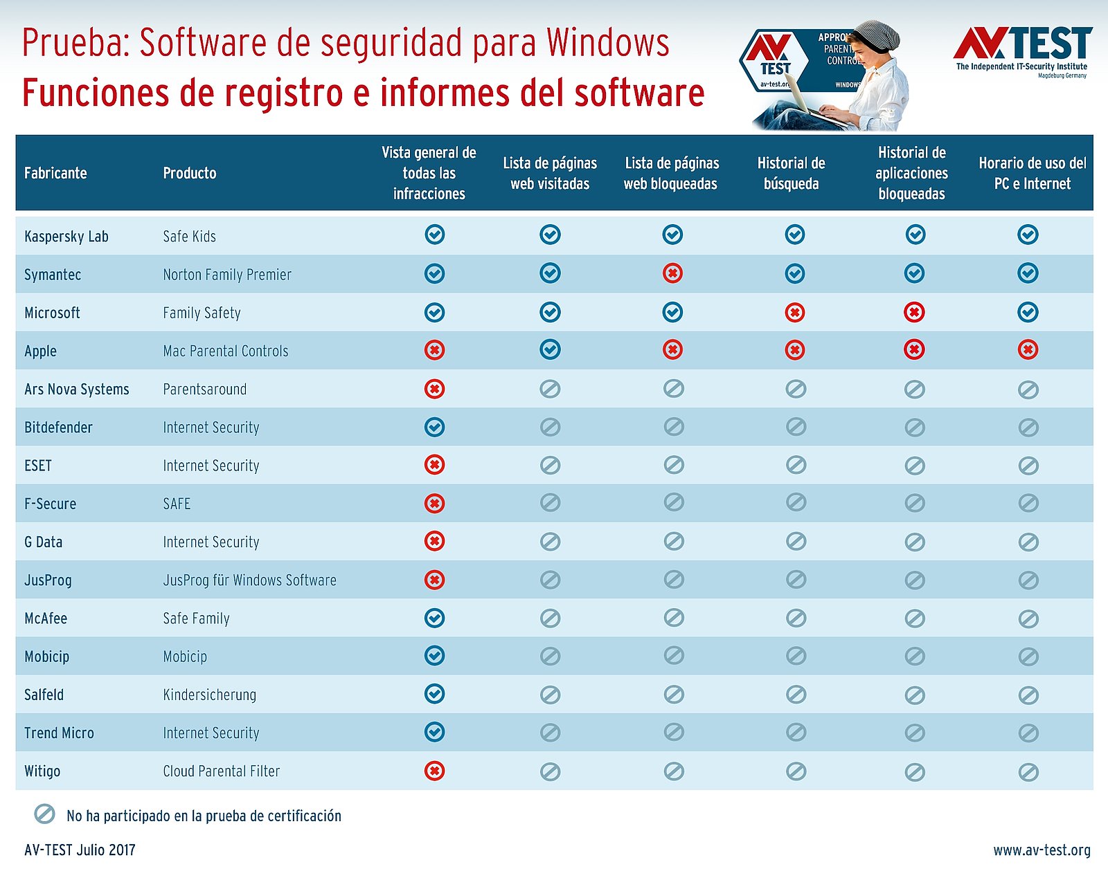 Las funciones de registro e informes de los paquetes de control parental registran gran parte de lo que pasa durante el uso del ordenador: qué páginas web se visitan, buscan o bloquean, el historial de búsqueda, así como el tiempo de uso del ordenador y de Internet. Todo esto junto se guarda en un resumen informativo. Los paquetes de Kaspersky Lab y Symantec cumplen estos aspectos. Las herramientas internas de Windows 10 y Mac OS Sierra pueden hacerlo parcialmente. Este área no se comprobó en el caso de los demás productos, ya que estos no participaron en la prueba de certificación. La tabla solo recoge si se cuenta con una vista general de todas las infracciones. Esto es algo que ofrecen, además de Kaspersky Lab y Symantec, los paquetes de Bitdefender, McAfee, Mobicip, Salfeld y Trend Micro.