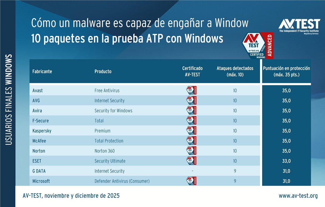 La serie de test ATP examina con regularidad si los programas de seguridad están a la altura de los tiempos y conocen los trucos y técnicas de ataque más nuevos. En la prueba realizada en noviembre y diciembre de 2025 se examinaron 10 productos para usuarios finales y 9 soluciones para empresas con Windows 11.