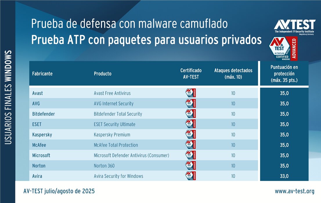 Casi todos los fabricantes de los 9 paquetes para usuarios privados examinados en la prueba tienen un motivo de celebración, puesto que 8 de los productos superaron la prueba ATP con los 35 puntos máximos para su puntuación en protección. Provienen de Avast, AVG, Bitdefender, ESET, Kaspersky, McAfee, Microsoft y Norton.