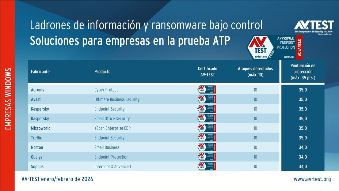 También 6 de las 9 soluciones de seguridad para sistemas Windows de empresas finalizaron la prueba de certificación sin fallos y con 35 puntos: Acronis, Avast, Kaspersky (con dos versiones), Microworld y Trellix.