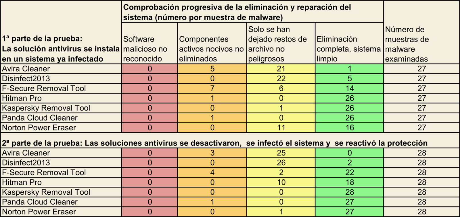 De los 10 paquetes de seguridad, las soluciones gratuitas de Avira, Avast y AVG, así como Microsoft Security Essentials, tuvieron algunos problemas. Dejaron componentes activos en el sistema entre 1 y 7 veces. El resto de productos comerciales y el gratuito Malwarebytes Anti-Malware limpiaron el sistema sin errores.