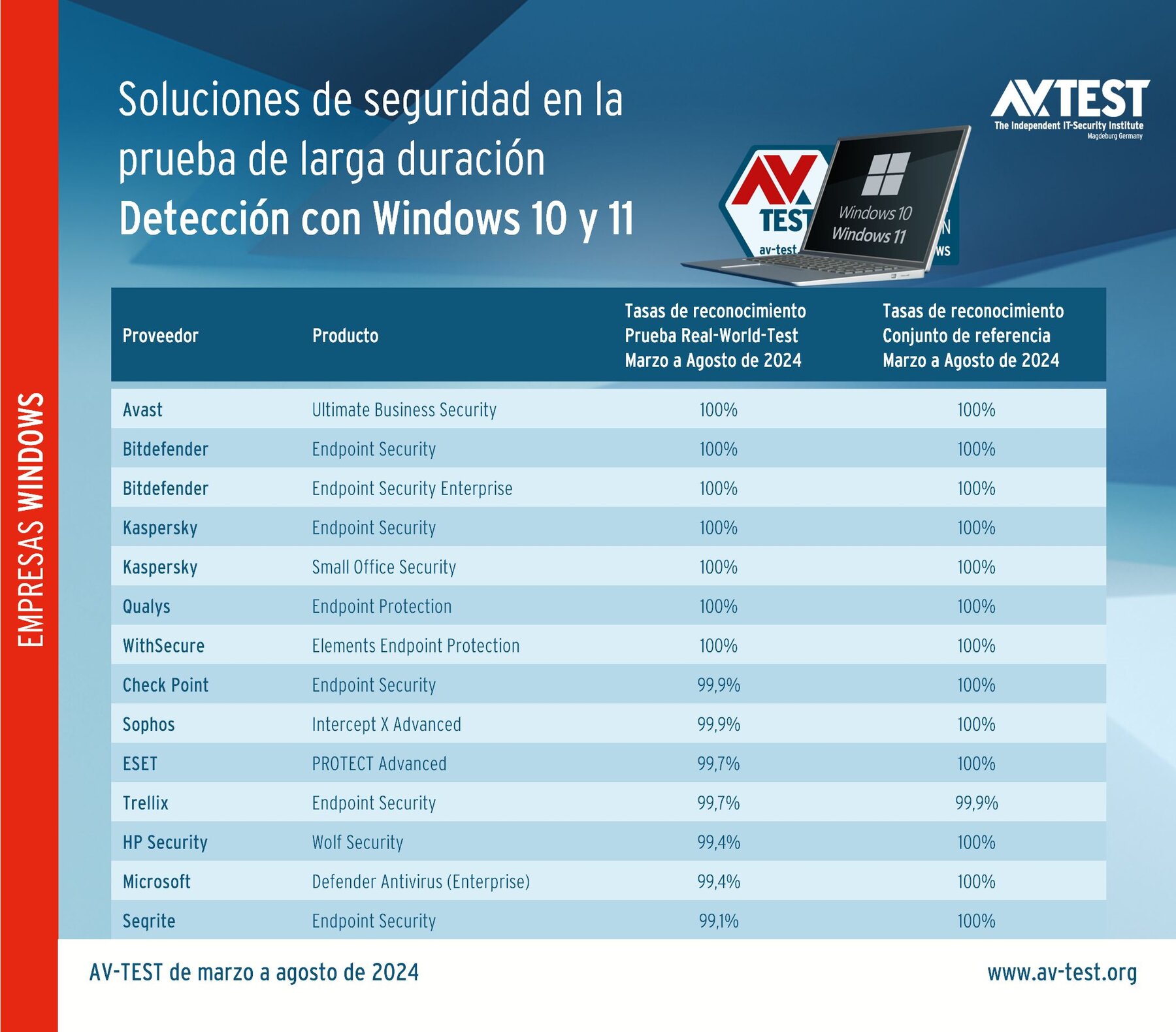 No obstante, las soluciones de Avast, Check Point, WithSecure, Microsoft, Qualys y Seqrite también compitieron al máximo nivel consiguiendo 17,8 y 17,7 puntos. Incluso al final de la tabla se ven puntuaciones cercanas a la máxima: Bitdefender (versión Enterprise) 17,5 puntos, Trellix y Sophos 17,4 y 17,3 puntos respectivamente. Incluso el último de la tabla, HP Security, convence con 17 de los 18 puntos.