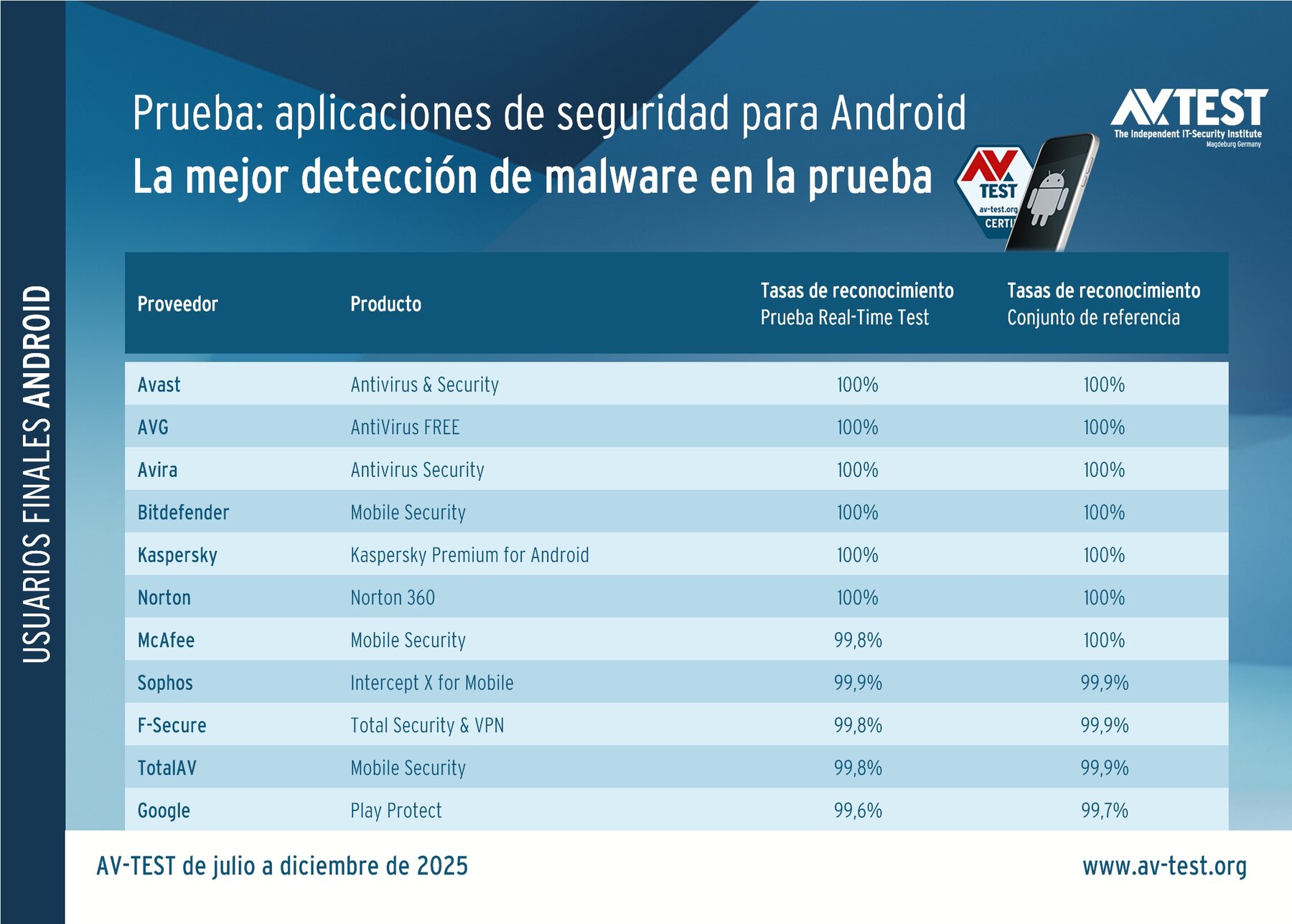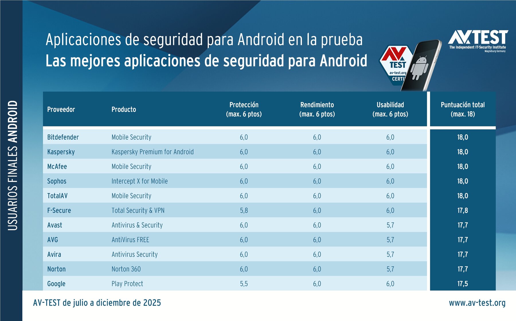 Según las estimaciones de expertos y Google hay hasta 4000 millones de dispositivos Android activos en el mundo, en los que se podría instalar una aplicación de seguridad. Esto es algo necesario puesto que incluso los dispositivos que no están rooteados están cada vez más expuestos a ataques de hackers con aplicaciones infectadas. Estas a menudo llevan ocultos exploits para vulnerabilidades que intentan apoderarse del dispositivo. Las aplicaciones de seguridad para Android efectivas lo impiden detectando las aplicaciones peligrosas o bloqueando acciones sospechosas. Los expertos de AV-TEST han averiguado qué aplicaciones de seguridad protegen mejor mediante su prueba semestral con Android llevada a cabo de julio a diciembre de 2025. En ella, las 10 aplicaciones de seguridad, así como la protección integrada de Google, Play Protect, demostraron la efectividad con la que defienden contra varios miles de ataques y dónde se colaran los atacantes con mayor facilidad.
