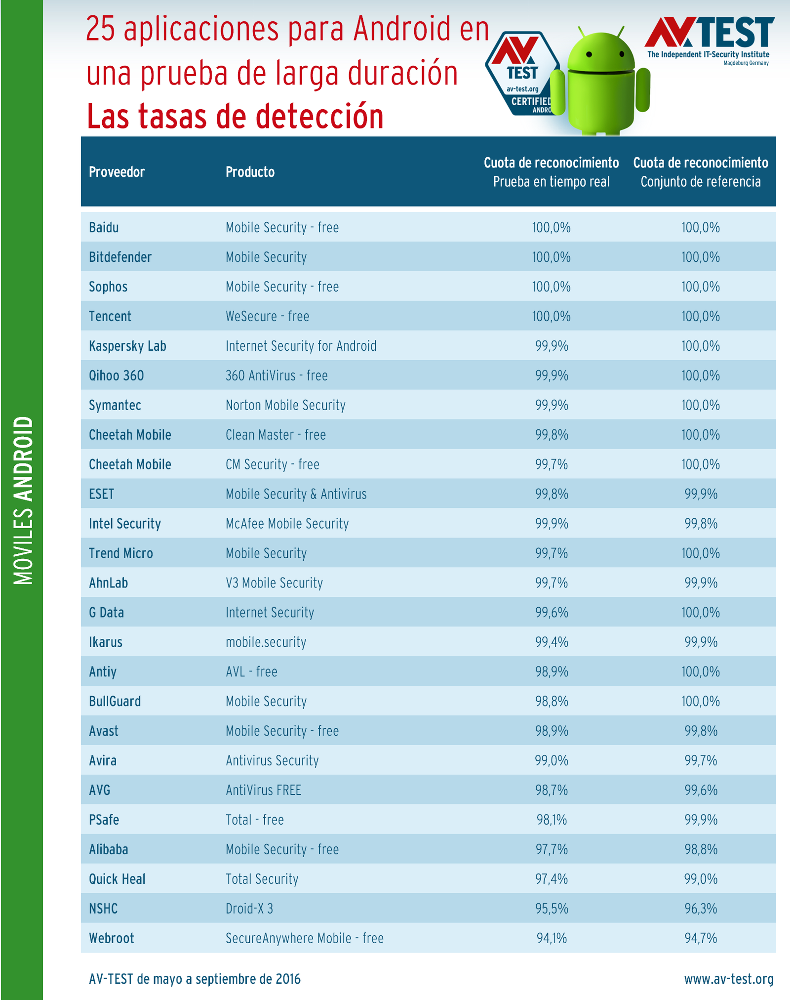 La protección aportada por las aplicaciones se comprobó en dos fases. Primero tuvieron que superar la prueba en tiempo real, en la que tuvieron que detectar y descartar aplicaciones infectadas totalmente nuevas, algunas solo tenían unas horas. En total han sido más de 10.500 aplicaciones. En la segunda sección de la prueba se trataba de detectar y eliminar las aplicaciones maliciosas del conjunto de referencia. Estas aplicaciones con malware son especialmente peligrosas y, al inicio de la respectiva prueba, tenían un máximo de 4 semanas de antigüedad. Los conjuntos incluyen en total otras 10.500 aplicaciones.