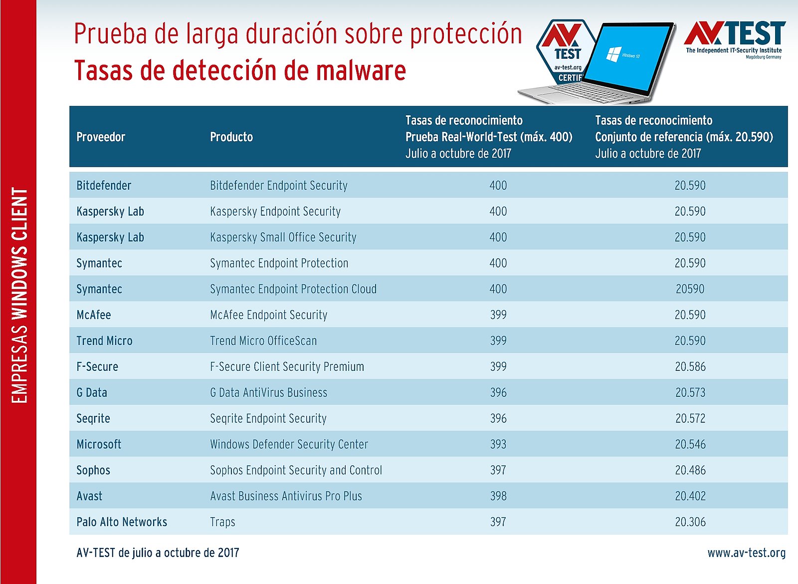 En la reciente prueba de larga duración, realizada de julio a octubre de 2017, las 5 soluciones de Bitdefender y de Kaspersky y Symantec, con dos versiones cada una, obtuvieron el mejor resultado. Estas detectaron en todas las fases de la prueba el total de los 400 atacantes de la prueba en condiciones reales y los 20.590 malwares del conjunto de referencia.