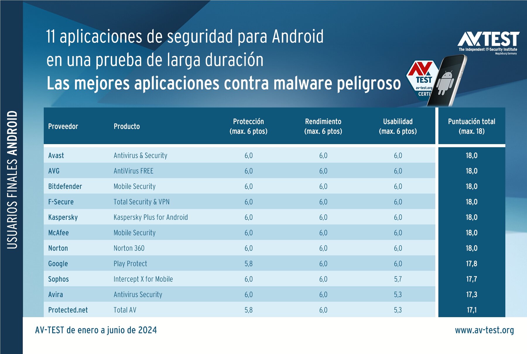 La prueba de larga duración realizada de enero a junio de 2024 a 11 aplicaciones de seguridad demuestra que hay muchos buenos productos para dispositivos Android. Las aplicaciones de seguridad de Avast, AVG, Bitdefender, F-Secure, Kaspersky, McAfee y Norton ocupan los primeros puestos de la tabla con los 18 puntos máximos alcanzables. No obstante, las restantes aplicaciones las siguen con una buena puntuación de entre 17,8 y 17,1 puntos. Los resultados realmente no son nada malos.