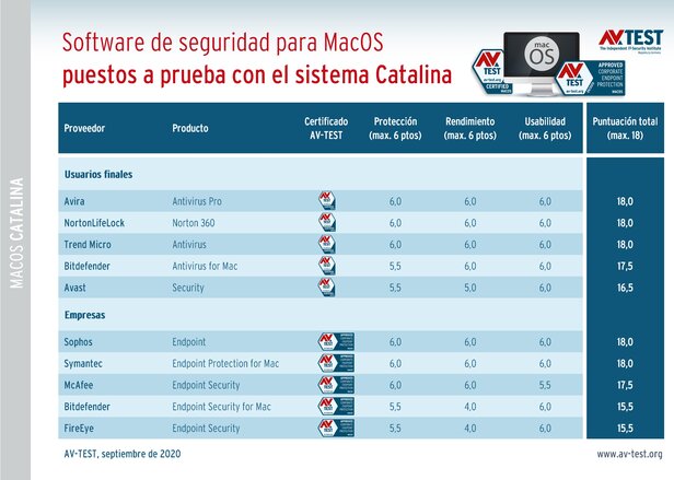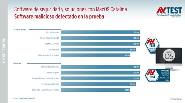 El laboratorio de AV-TEST examinó en septiembre de 2020 productos de seguridad para usuarios de Mac privados y soluciones para empresas. Como plataforma de prueba se utilizó la versión 10.15 de MacOS Catalina. Los 5 paquetes de seguridad para usuarios privados analizados son los de Avast, Avira, Bitdefender, NortonLifeLock y Trend Micro. Las soluciones empresariales proceden de Bitdefender, FireEye, McAfee, Sophos y Symantec.