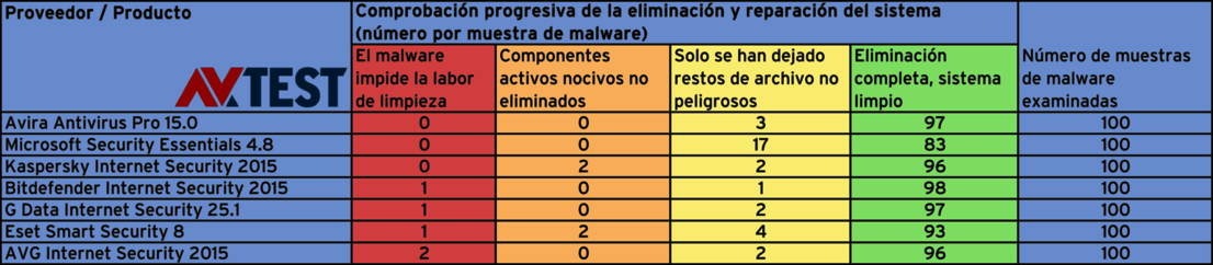 Durante toda la duración de la prueba se realizaron una y otra vez tests con diferentes familias de malware, dado que estas evolucionan constantemente. Las muestras de malware utilizadas eran soluciones ya conocidas en el momento de la correspondiente prueba, por lo que debían ser reconocidas en todo caso. En las tablas de las pruebas se recoge la calidad de la limpieza y reparación en el siguiente orden: