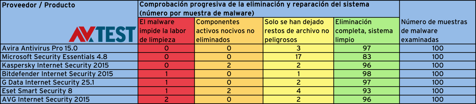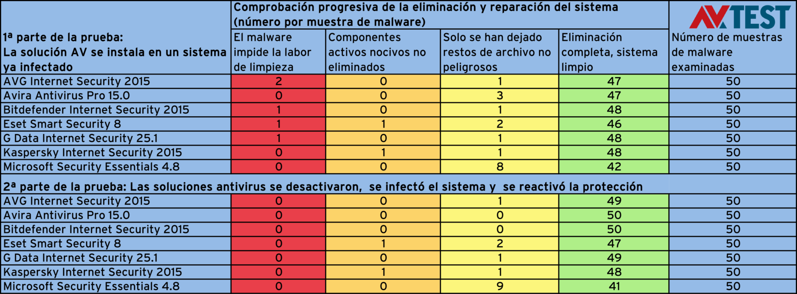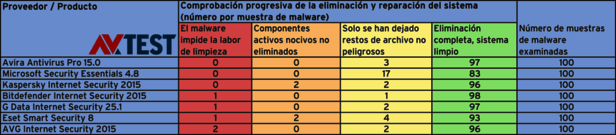 Durante toda la duración de la prueba se realizaron una y otra vez tests con diferentes familias de malware, dado que estas evolucionan constantemente. Las muestras de malware utilizadas eran soluciones ya conocidas en el momento de la correspondiente prueba, por lo que debían ser reconocidas en todo caso. En las tablas de las pruebas se recoge la calidad de la limpieza y reparación en el siguiente orden: