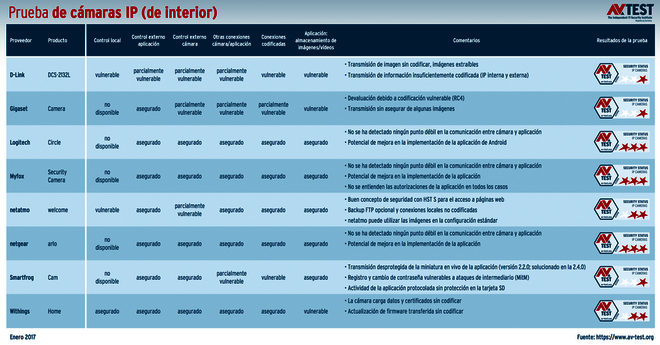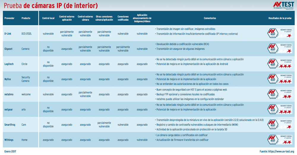 La siguiente tabla revela cuáles son las cámaras IP actuales recomendables según las pruebas de seguridad de AV-TEST. Encontrará los resultados de las pruebas de seguridad realizadas periódicamente con productos IoT y para hogares inteligentes en la página web de AV-TEST y en nuestro blog IoT.
