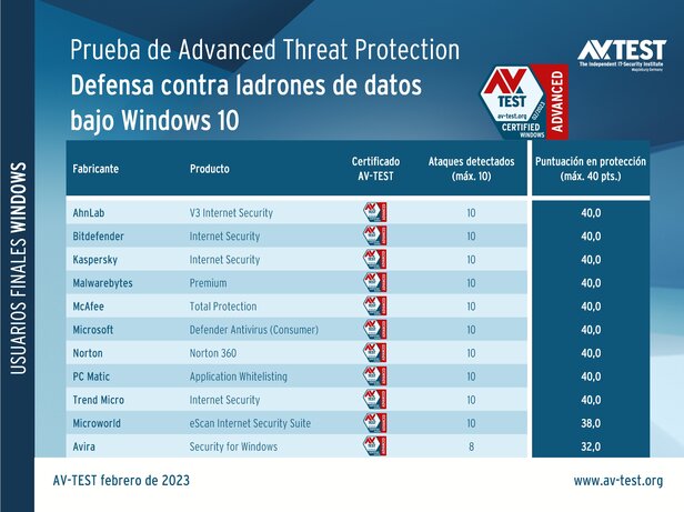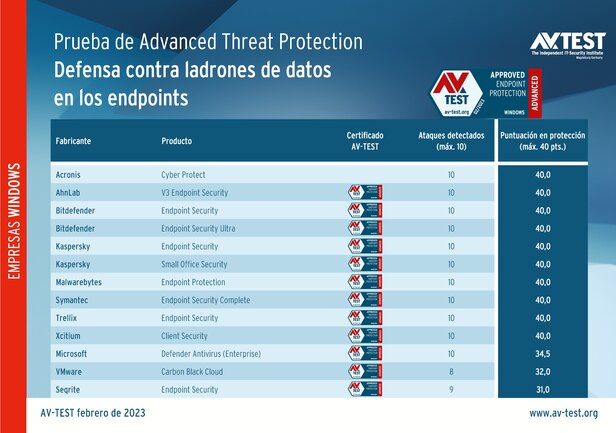 Mediante los test de Advanced Threat Protection, el laboratorio de AV-TEST examinó en enero y febrero de 2023, con Windows 10, 24 soluciones de seguridad contra ladrones de datos para usuarios privados y empresas. Para ello, los productos tienen que detectar a los atacantes o detenerlos en pasos subsiguientes mediante diversas técnicas de defensa y proteger así los sistemas en 10 escenarios. Por cada paso dentro de un escenario, como la detección o el uso de otras técnicas, el laboratorio otorga hasta 4 puntos. Por lo tanto, los productos pueden conseguir hasta 40 puntos para su puntuación en protección. 9 de los 11 paquetes para usuarios privados, los consiguieron. De las soluciones para empresas, 10 de los 13 candidatos obtuvieron en la prueba la máxima puntuación de 40.