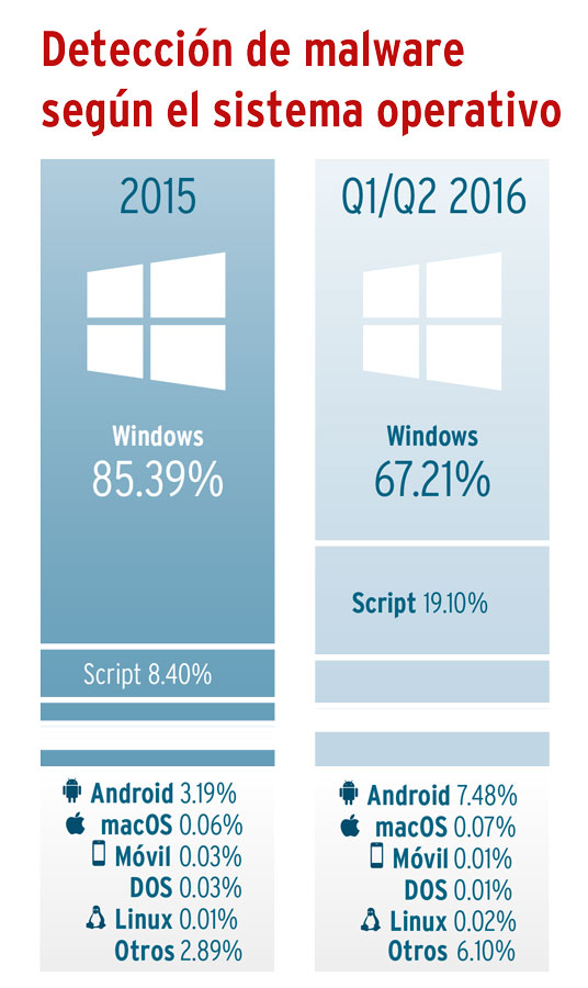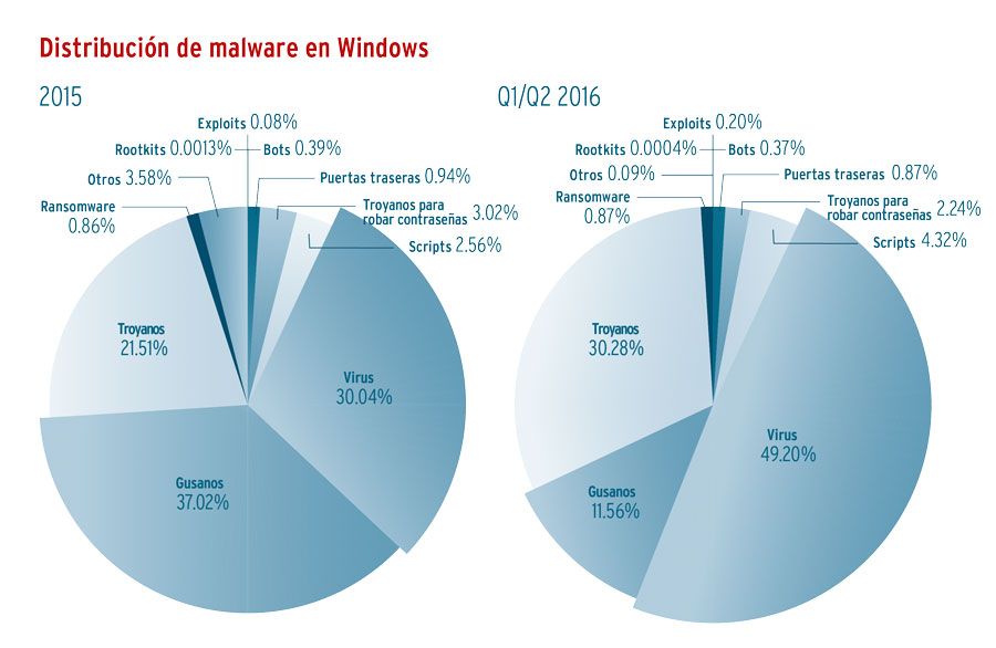 Para los ataques de malware a usuarios de Windows, los criminales recurrieron en 2015 con especial frecuencia a los gusanos de Internet. Más de un tercio de todo el malware detectado recayó en esta categoría de programas dañinos. En segundo y tercer lugar les siguieron los clásicos virus informáticos, así como el sinnúmero de troyanos especializados como los de banca online y el ransomeware, muy extendido en 2015. Este año, los criminales han cambiado su estrategia y, hasta ahora, los ataques se han basado mayoritariamente en virus y troyanos. La propagación de los virus, por ejemplo, ha aumentado en un 19 por ciento.