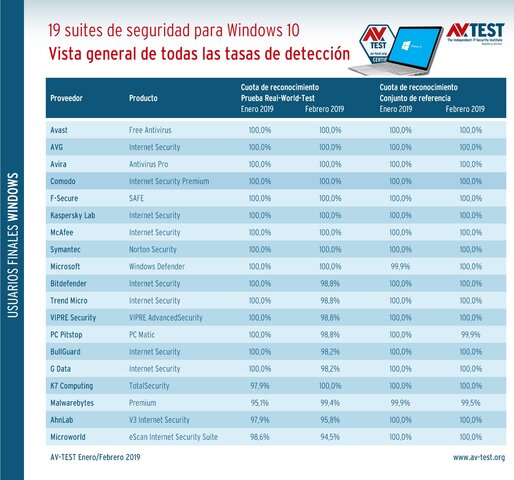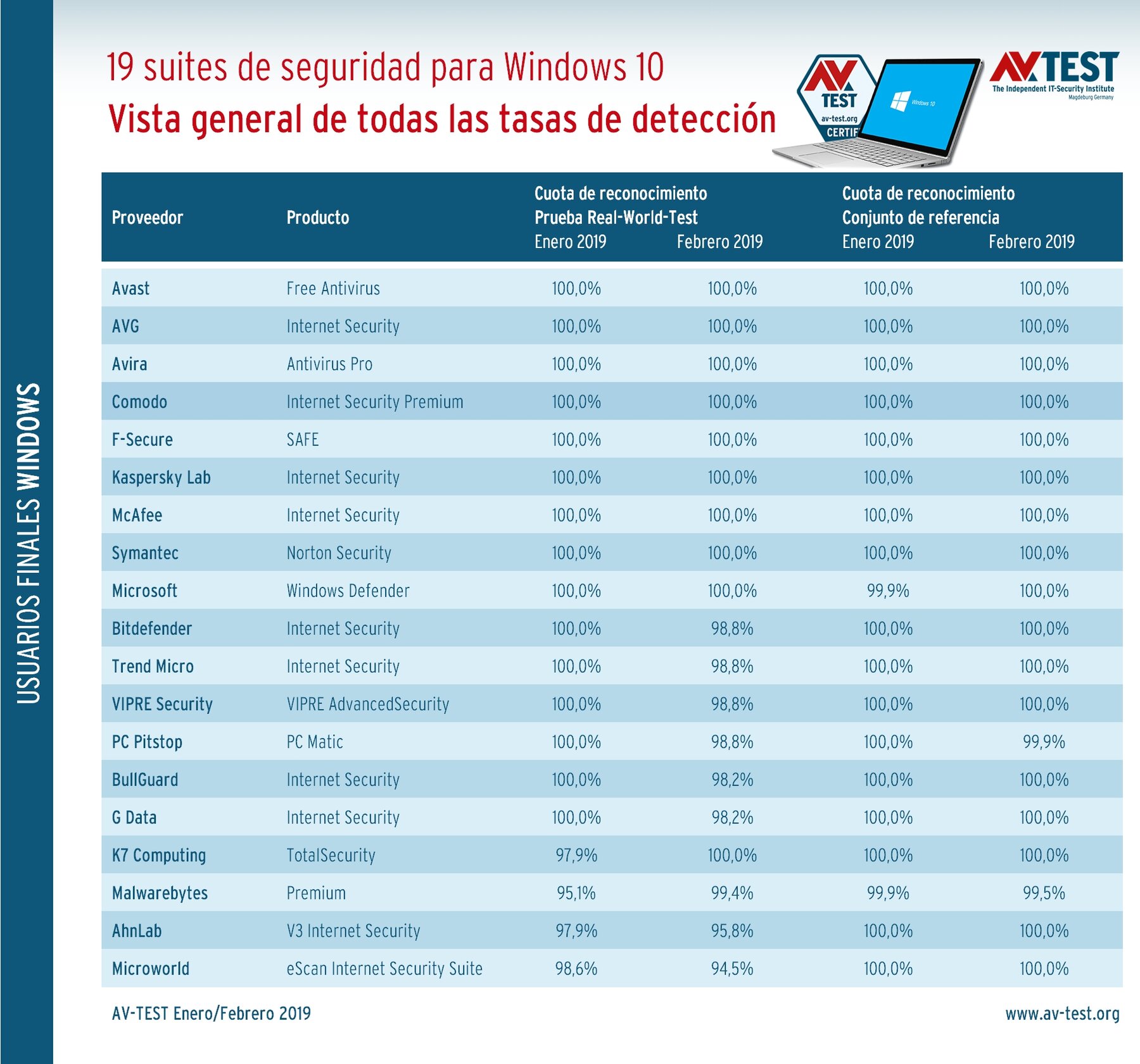 Los primeros 8 productos pudieron cerrar todas las pruebas de protección con una detección del 100 por cien. Son los procedentes de Avast, AVG, Avira, Comodo, F-Secure, Kaspersky Lab, McAfee y Symantec. El paquete de Microsoft cometió nimios fallos de detección en una de las vueltas. En total, 9 paquetes merecieron los codiciados 6 puntos en la sección de protección. Otros 7 paquetes obtuvieron 5,5 puntos, que también es un resultado muy bueno. Solo las 3 últimas soluciones, de AhnLab, Microworld y Malwarebytes, se quedaron en solo 4,5 puntos.