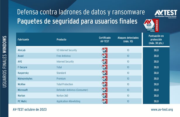 Los productos de seguridad para usuarios privados proceden de estos fabricantes: AhnLab, Avast, AVG, F-Secure, Kaspersky, Malwarebytes, McAfee, Microsoft, Norton y PC Matic.