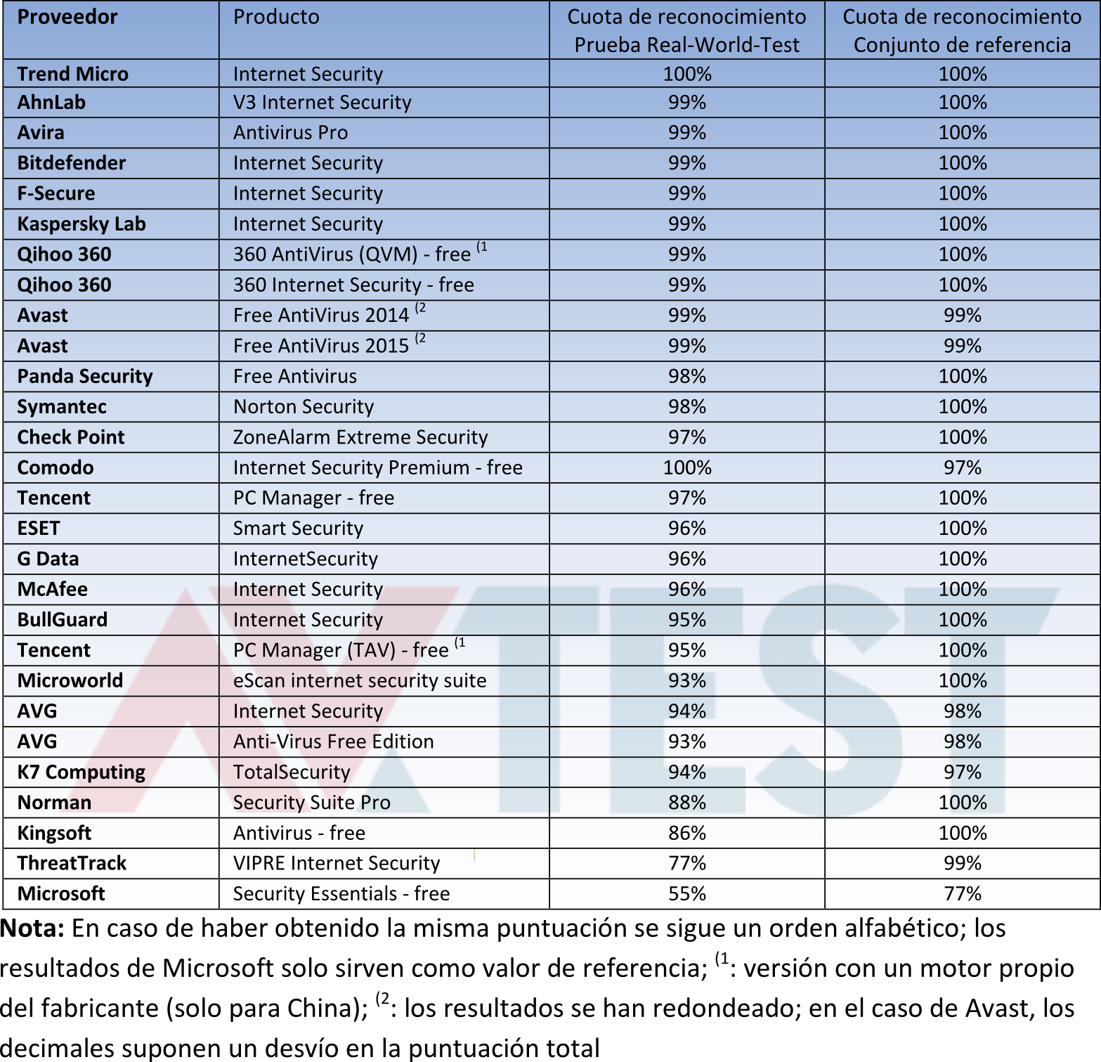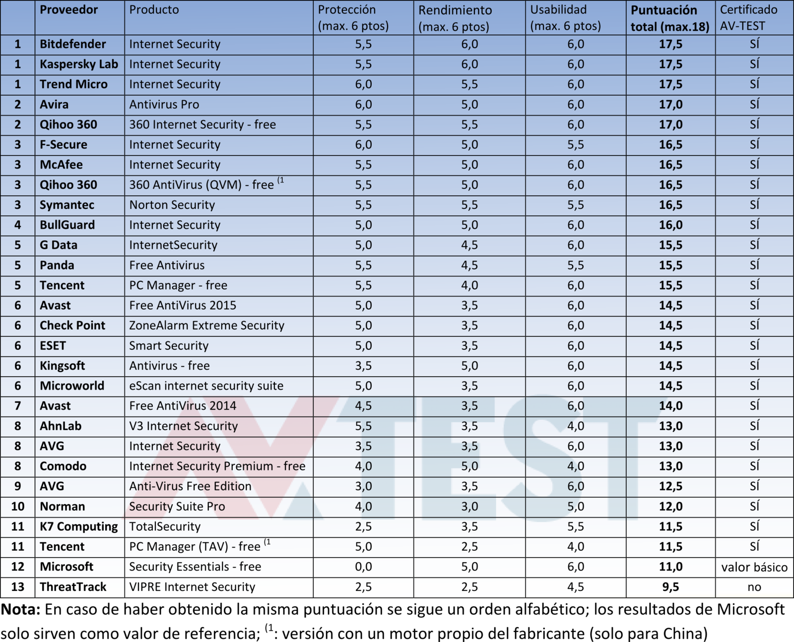 Tres productos consiguieron 17,5 puntos, es decir, casi el máximo de 18 puntos (AV-TEST, versión de enero de 2015).