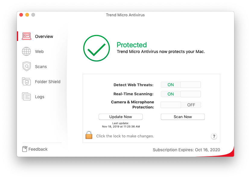 En octobre et novembre 2019, nous avons évalué 11 produits de sécurité pour les utilisateurs domestiques pour MacOS Sierra. Nous avons toujours utilisé la version la plus récente de tous les produits pour les tests. Ils ont été autorisés à se mettre à jour et à interroger leurs services dans le cloud. Nous nous sommes concentrés sur la détection de logiciels malveillants, les faux positifs et les performances.