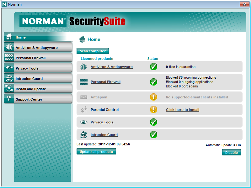 Aux mois de novembre et décembre 2011, AV-TEST a examiné 23 produits de sécurité destinés aux particuliers, dans leur configuration standard. Pour réaliser ces tests, les dernières versions de produits disponibles au public ont été utilisées. Grâce à la mise en jour en ligne, les versions ont pu être mises à jour à tout moment et leurs services « en nuages » étaient accessibles en permanence. AV-TEST n’a pris en compte que des scénarios de test réalistes et testé les produits par rapport aux menaces actuelles. Les produits ont dû prouver leurs capacités lors de l’utilisation de l’ensemble des fonctions et des niveaux de protection.