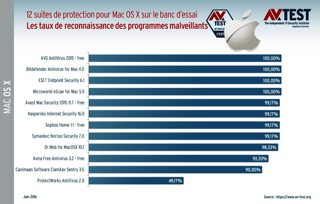 En ce qui concerne l’identification des programmes malveillants, 4 des 12 suites atteignent le taux maximal de 100 % : AVG, Bitdefender, ESET et Microworld. 4 autres suites ont fait des petites erreurs qui leur valent un taux de reconnaissance de 99,17 % : Avast, Kaspersky, Sophos et Symantec. Ce taux diminue pour les produits de Dr. Web, Avira, Canimaan Software et ProtectWorks. Ils n’identifient plus que 49 à 98,33 % des virus du test. Le laboratoire a utilisé 120 programmes malveillants sélectionnés pour Mac qu’il avait collecté durant les mois précédents le test.