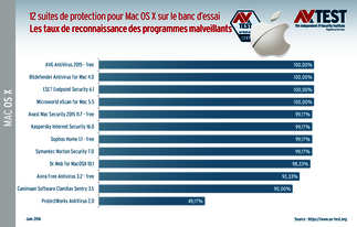 En ce qui concerne l’identification des programmes malveillants, 4 des 12 suites atteignent le taux maximal de 100 % : AVG, Bitdefender, ESET et Microworld. 4 autres suites ont fait des petites erreurs qui leur valent un taux de reconnaissance de 99,17 % : Avast, Kaspersky, Sophos et Symantec. Ce taux diminue pour les produits de Dr. Web, Avira, Canimaan Software et ProtectWorks. Ils n’identifient plus que 49 à 98,33 % des virus du test. Le laboratoire a utilisé 120 programmes malveillants sélectionnés pour Mac qu’il avait collecté durant les mois précédents le test.