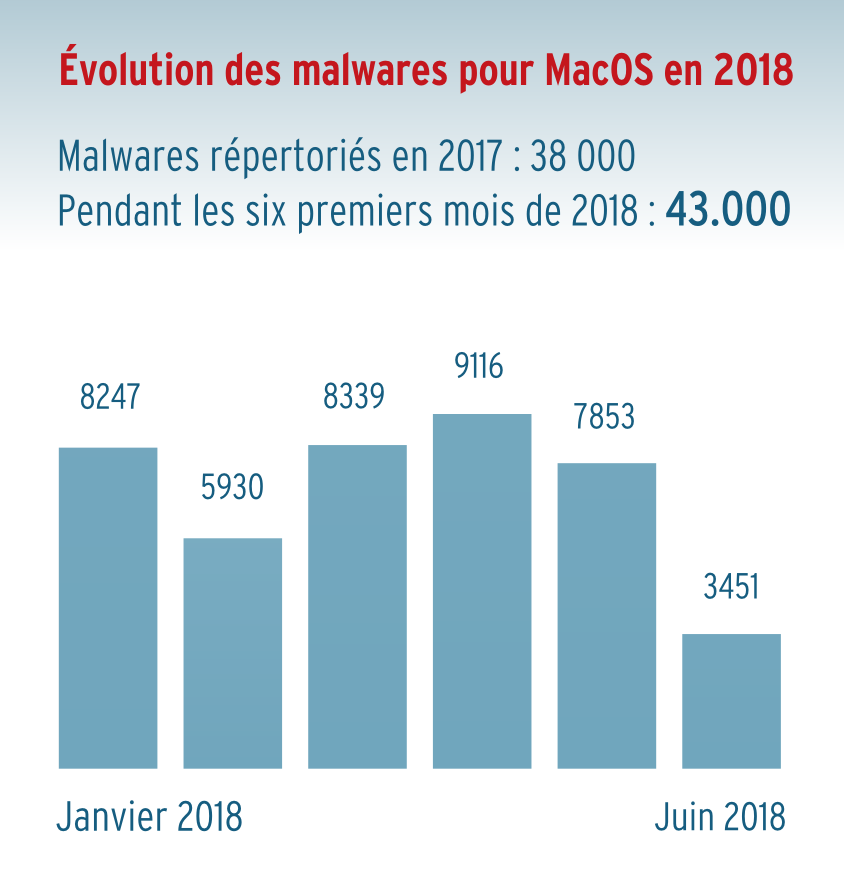 Les produits Mac sont de plus en plus la cible des auteurs de malwares. En juin 2018, le nombre de nouveaux produits malveillants recensés pour MacOS s'élève déjà à 37 000 exemplaires – pratiquement l'équivalent de l'année 2017 avec 43 000 exemplaires. Certes, c'est beaucoup moins que pour les produits Windows, mais ce nombre excède de 100 fois et plus ce que les experts Mac prédisaient il y a des années.