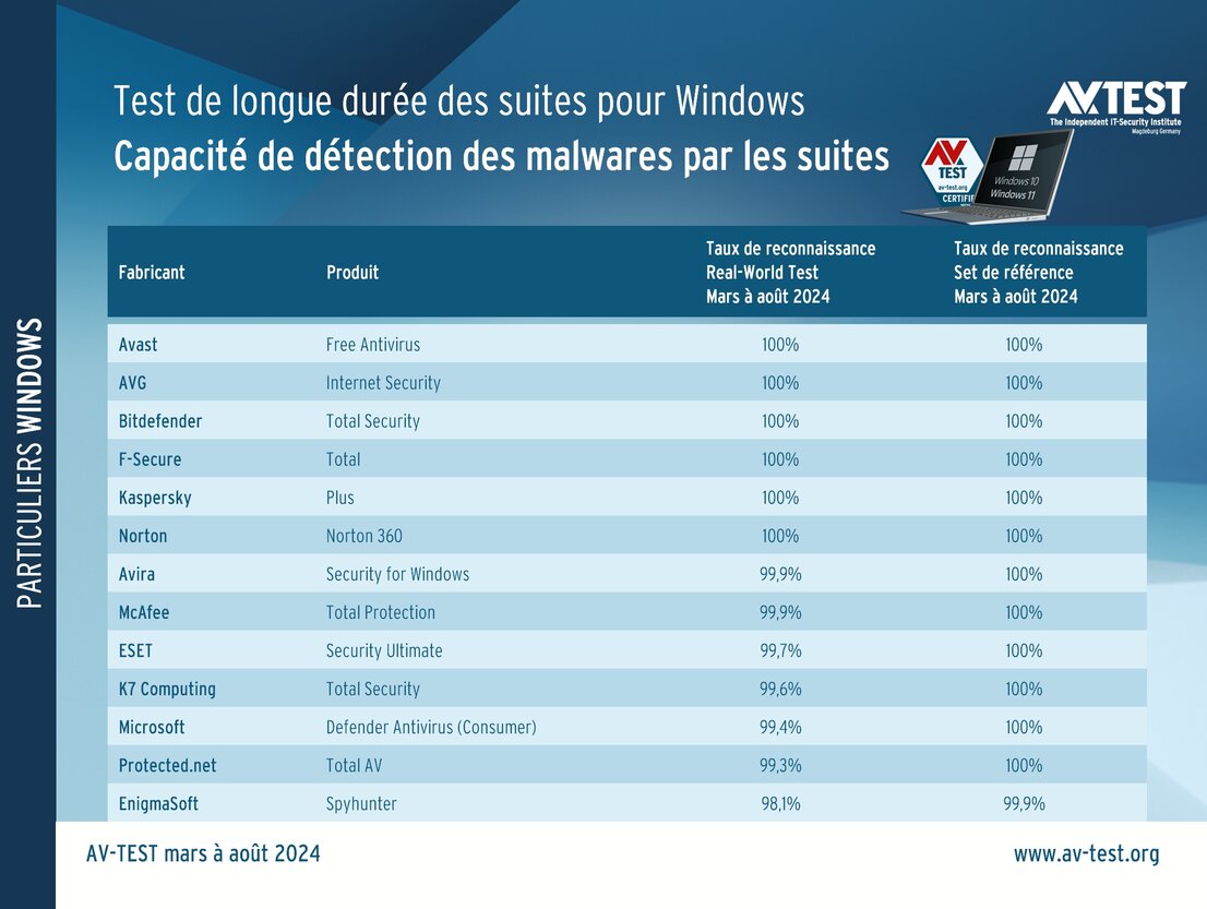 13 suites de sécurité soumises au test longue durée sous Windows 10 & 11de mars à août 2024