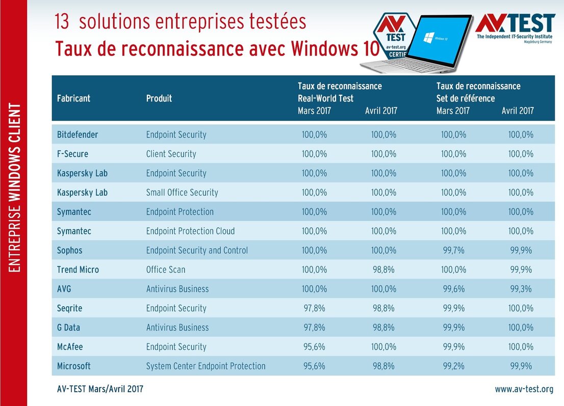 Le laboratoire a passé les mois de mars et avril 2017 à examiner 13 solutions client-serveur pour les entreprises utilisant Windows 10. Durant ces deux mois, les produits ont été testés dans les catégories Protection, Performance et Utilisation. Les testeurs pouvaient attribuer jusqu’à 6 points par catégorie. La note maximale était donc de 18/18.