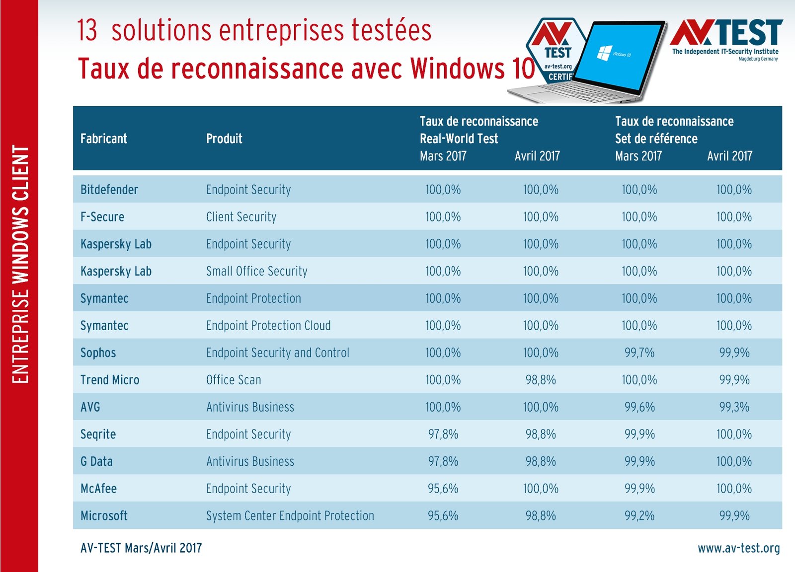 Le laboratoire a passé les mois de mars et avril 2017 à examiner 13 solutions client-serveur pour les entreprises utilisant Windows 10. Durant ces deux mois, les produits ont été testés dans les catégories Protection, Performance et Utilisation. Les testeurs pouvaient attribuer jusqu’à 6 points par catégorie. La note maximale était donc de 18/18.