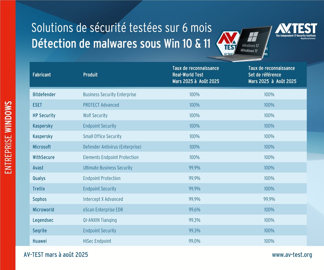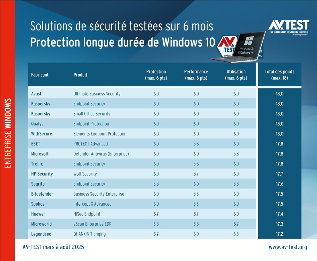 Les entreprises doivent donc impérativement se doter de la meilleure cybersécurité possible. La solution de protection des points de terminaison que l’on a souvent déclarée dépassée reste pourtant le cœur de la sécurité informatique d’une entreprise. Actuellement, une autre problématique est apparue : les systèmes Windows 10 ne sont plus mis à jour si les entreprises n’ont pas souscrit aux mises à jour de sécurité étendues (Extended Security Updates, ESU) de Microsoft. Certaines entreprises commencent seulement à planifier la migration des systèmes sur Windows 11. Mais la solution de protection des points terminaux fiable protège-t-elle les clients aussi efficacement sous le nouveau système que sous Windows 10 ? Le test de longue durée actuel réalisé sur 15 solutions pour entreprises répond exactement à cette question. Ce test a été réalisé de mars à août 2025 et le laboratoire a évalué les produits sous Windows 10 et 11.