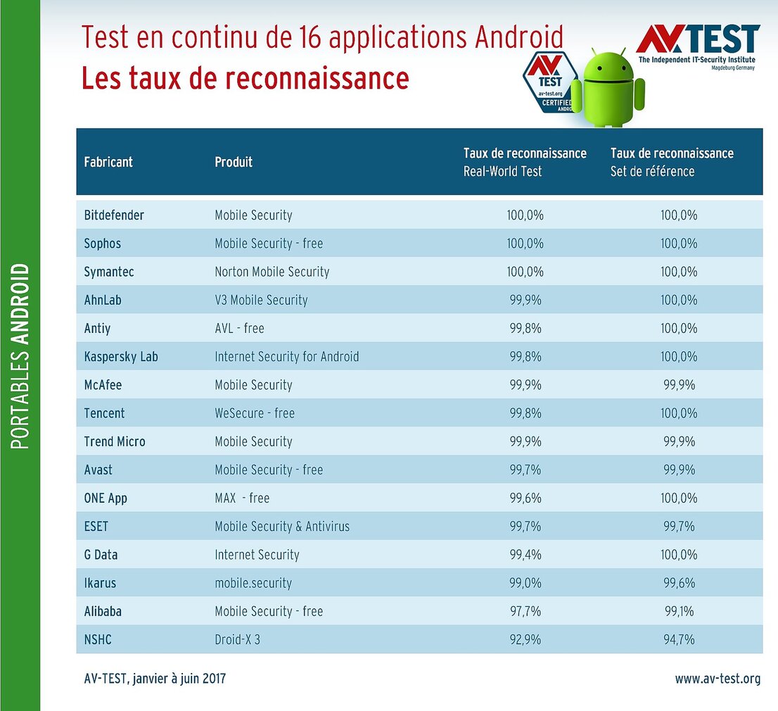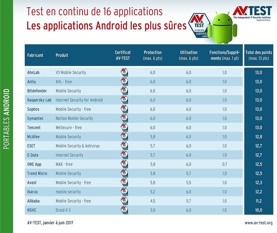 D’après les statistiques, il existe plus de 2,5 milliards d’appareils Android dans le monde. Or, plus de 20 millions de programmes malveillants ont pour but de les attaquer. Lors d’un test en continu réalisé de janvier à juin 2017, le laboratoire a testé la capacité de protection des applications pour Android et peut donc en recommander plusieurs.