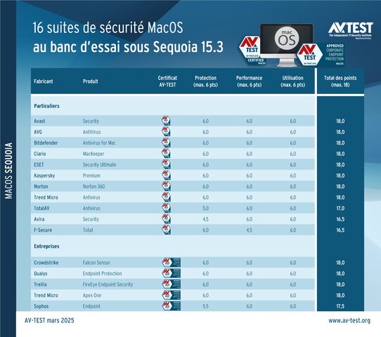Les experts du laboratoire AV-TEST ont testé entre janvier et mars 2025 un total de 16 produits de protection MacOS destinés aux utilisateurs particuliers et aux entreprises
