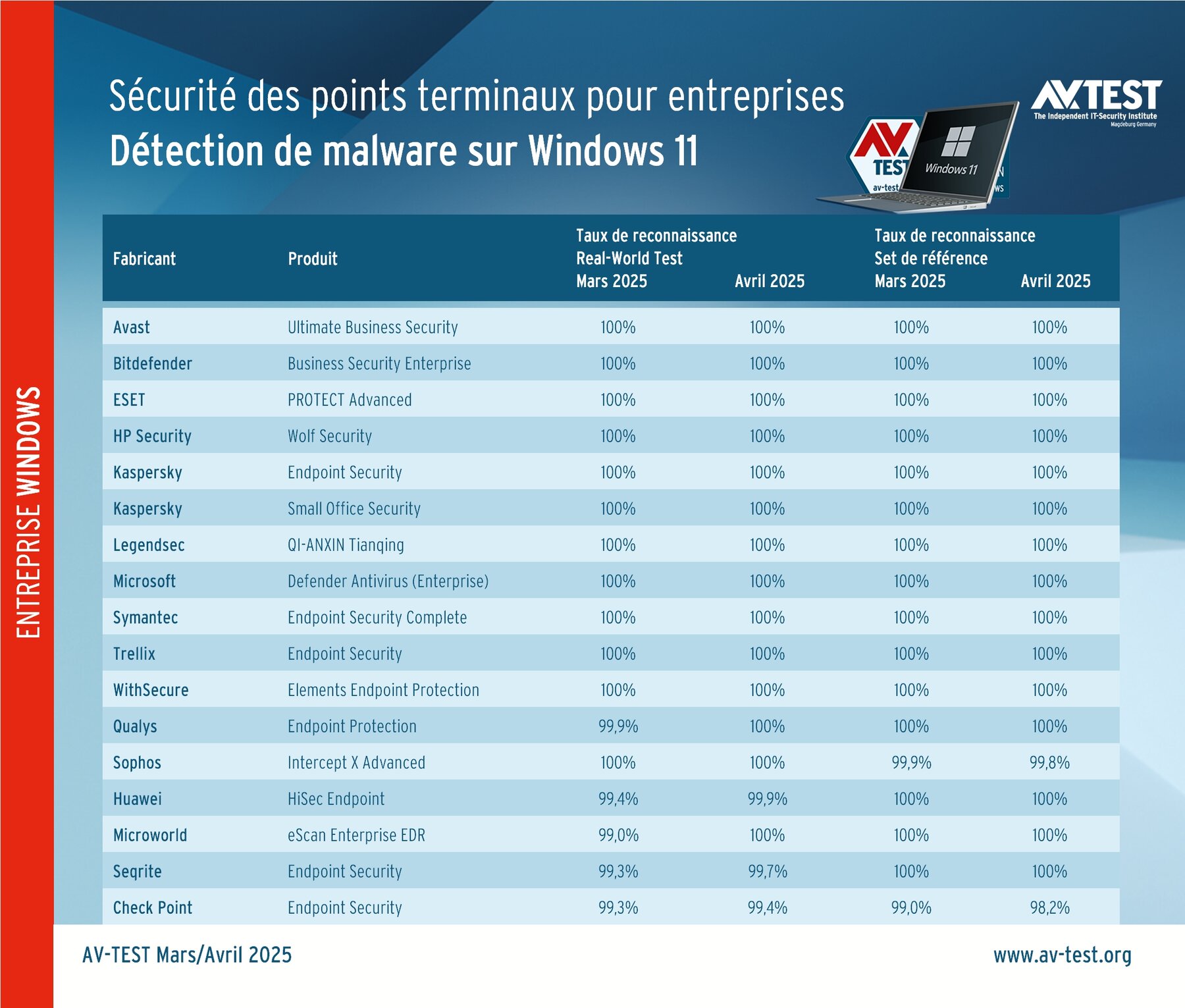 Les entreprises sont et restent des cibles privilégiées pour les cyberattaques. Pour les grands groupes comme pour les PME, se doter d’une résistance robuste pour protéger les données et les secrets industriels, mais aussi pour répondre aux nombreuses normes en matière de protection des données telles que le RGPD ou la prochaine directive NIS2 est absolument indispensable. Une sécurisation parfaite des PC en entreprise est donc un enjeu primordial. Dans leur série de tests des PC de bureau Windows 11, les experts en cybersécurité d’AV-TEST ont examiné et certifié 17 logiciels de protection. En mars et avril 2025, 17 produits sous Windows ont été soumis à des tests approfondis portant sur la protection, la performance et l’utilisation. Le laboratoire a utilisé plus de 20 000 échantillons de programmes malveillants pour tester les capacités de défense, ainsi que près de