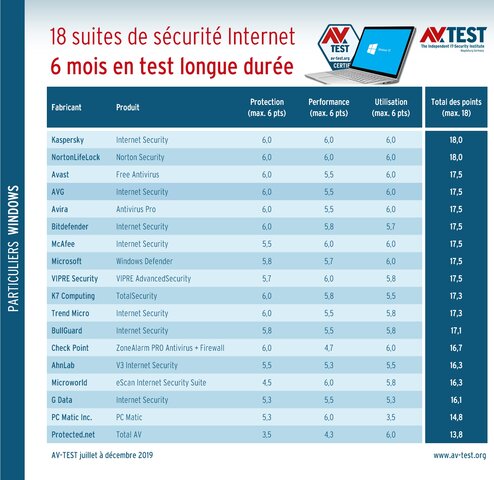 Dans les trois grandes sections du test, chaque suite peut obtenir jusqu’à 6 points, soit 18 points au total. Au cours du test longue durée effectué de juillet à décembre 2019, seules les suites de Kaspersky et NortonLifeLock ont décroché la meilleure note. Elles sont suivies de 7 produits qui ont effectué une bonne performance, totalisant 17,5 points : Avast, AVG, Avira, Bitdefender, McAfee, VIPRE Security et même Microsoft. Les suites de K7 Computing, Trend Micro et BullGuard se situent dans la partie supérieure du classement avec 17,3 et 17,1 points. Check Point, AhnLab, Microworld et G Data obtiennent entre 16,7 et 16,1 points. PC Matic et Protected.net sont lanternes rouges avec respectivement 14,8 et 13,8 points.