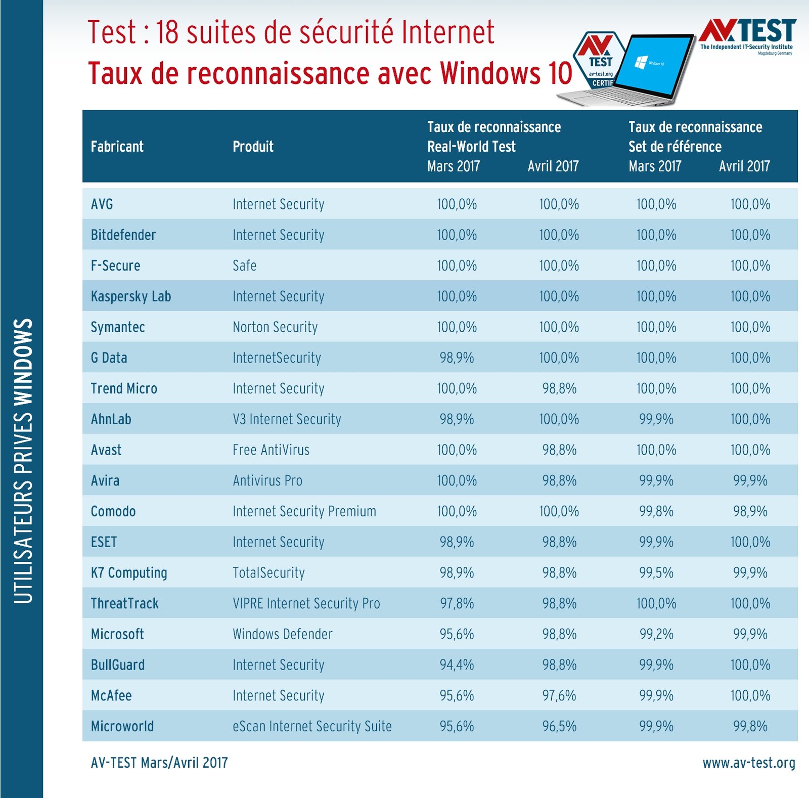 Windows 10 est de plus en plus populaire et gagne chaque jour de nombreux nouveaux utilisateurs. Bien sûr, le fait que Windows 10 ait longtemps été proposé gratuitement et que chaque nouvel ordinateur soit livré avec ce système facilite sa conquête du marché. Si vous êtes en train de migrer vers Windows 10 ou que vous comptez bientôt le faire, alors vous aurez besoin d’une bonne suite de protection. Oui, mais laquelle ? Votre ancienne solution pour Windows 7 ou 8 était-elle la meilleure ou bien l’une des célèbres suites de protection fonctionne-t-elle mieux en ce qui concerne Windows 10 ? Le laboratoire d’AV-TEST peut vous fournir les réponses à ces questions !