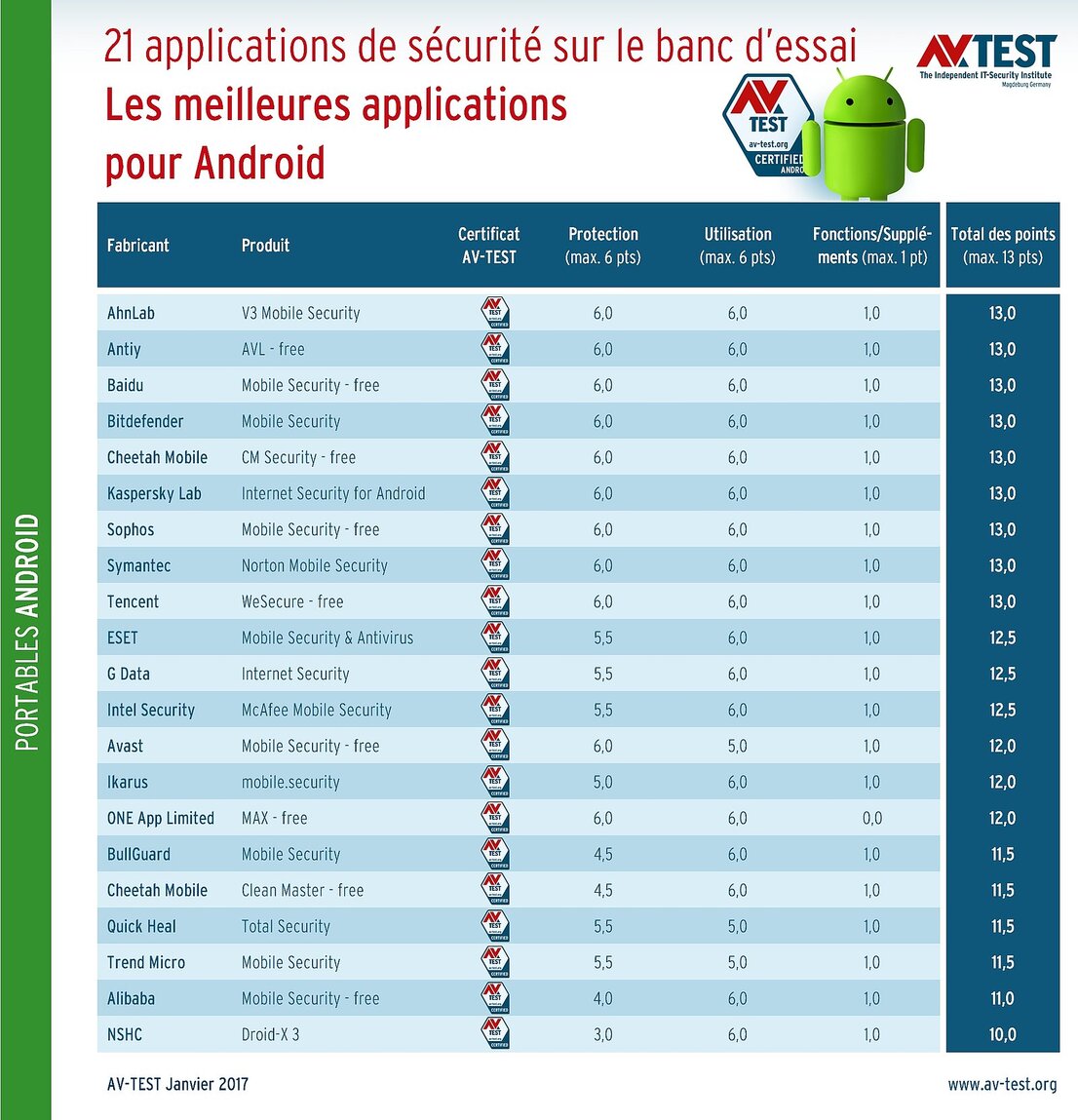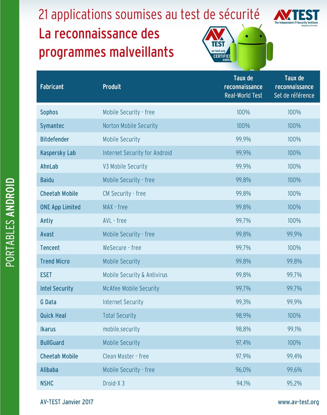 La note de 13/13 a également été atteinte par AhnLab, Antiy, Baidu, Bitdefender, Cheetah Mobile (CM Security), Kaspersky Lab et Tencent. L’application de Baidu n’est toutefois disponible qu’en chinois. Avec un 12,5/13, les applications d’ESET, G Data et McAfee (Intel Security) peuvent aussi être fières de leur performance.