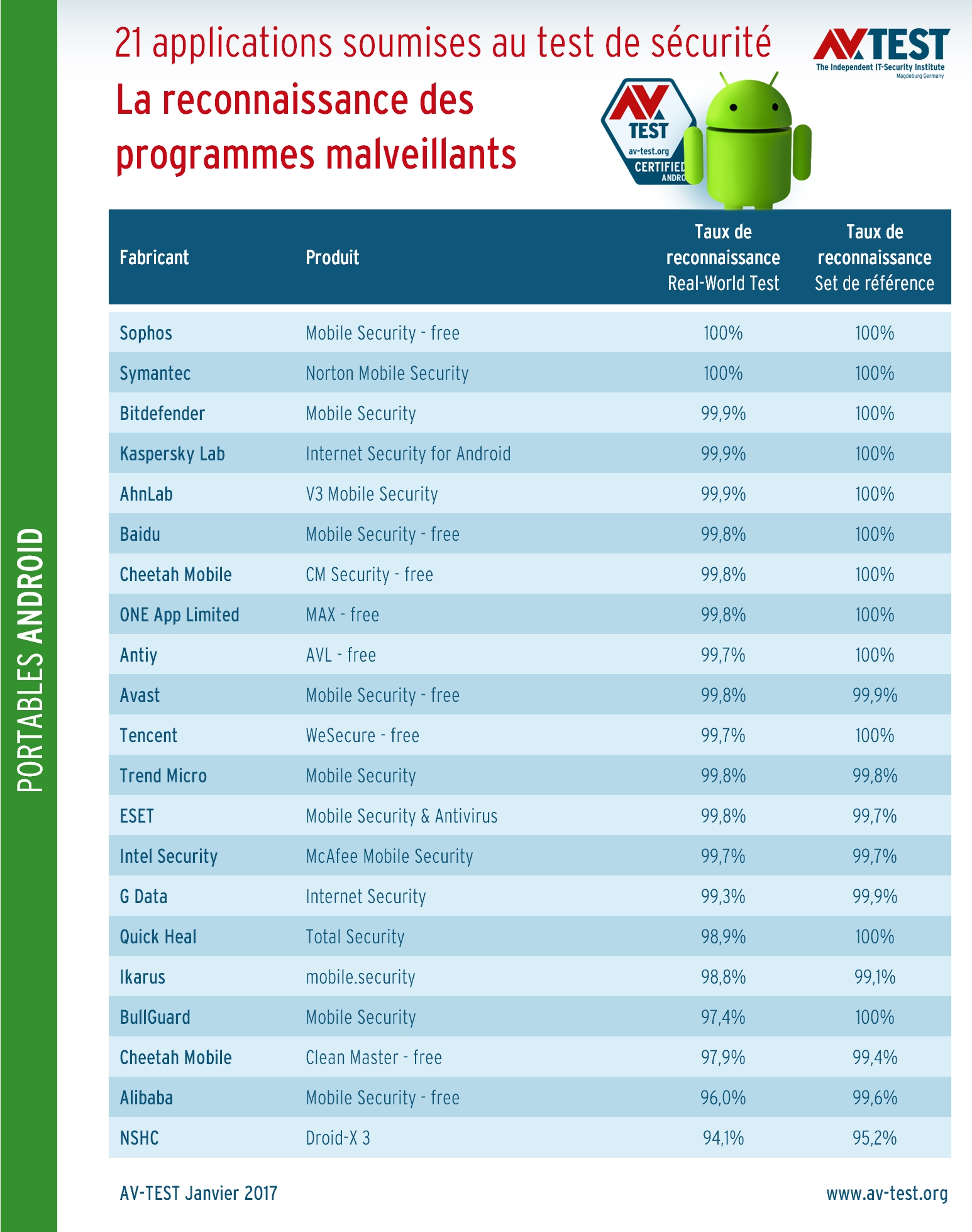 La note de 13/13 a également été atteinte par AhnLab, Antiy, Baidu, Bitdefender, Cheetah Mobile (CM Security), Kaspersky Lab et Tencent. L’application de Baidu n’est toutefois disponible qu’en chinois. Avec un 12,5/13, les applications d’ESET, G Data et McAfee (Intel Security) peuvent aussi être fières de leur performance.