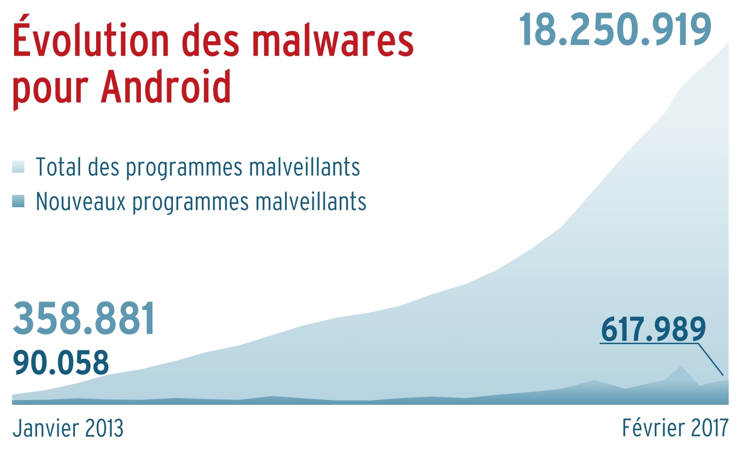 Quiconque découvre les statistiques actuelles sur les programmes malveillants Android vérifie immédiatement l’application de protection installée sur son appareil mobile : en effet, plus de 18 millions de programmes malveillants ont déjà été comptabilisés. Et il ne semble pas que leur croissance risque de stagner dans un proche avenir. Environ 600 000 nouveaux malwares viennent s’y ajouter chaque mois et ces programmes incluent désormais aussi des ransomwares. Ces programmes malveillants cryptent les données de l’appareil et ne les rendent que contre paiement d’une rançon.