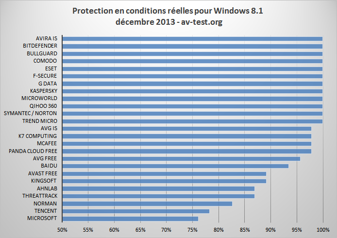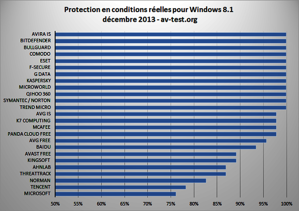 lors du test en conditions réelles est particulièrement important puisqu'il montre dans quelle mesure la suite de protection identifie les programmes malveillants encore inconnus. Les données présentées sont respectivement issues de la moyenne des deux mois de test (AV-TEST, test des suites pour ordinateurs de bureau novembre/décembre 2013).
