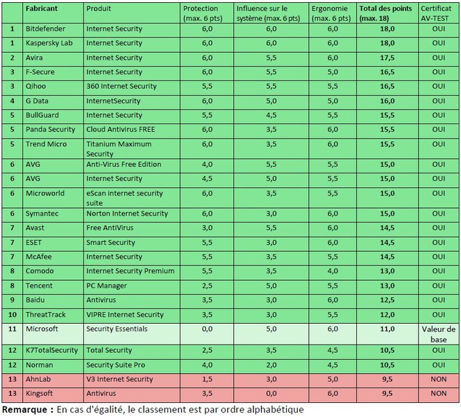 ont réussi à obtenir la note maximale de 18/18 : Bitdefender et Kaspersky Lab. La meilleure solution de protection gratuite n'occupe que la 5e place (AV-TEST, test des suites pour ordinateurs de bureau novembre/décembre 2013).