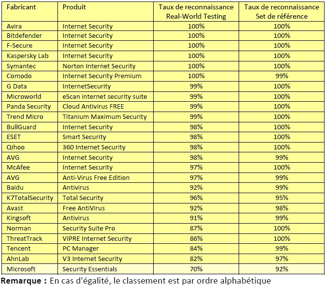 Les suites de protection proposées par Avira (version payante), Bitdefender, F-Secure, Kaspersky Lab, Symantec et Comodo atteignent quant à elles un taux d'identification de 100 %.