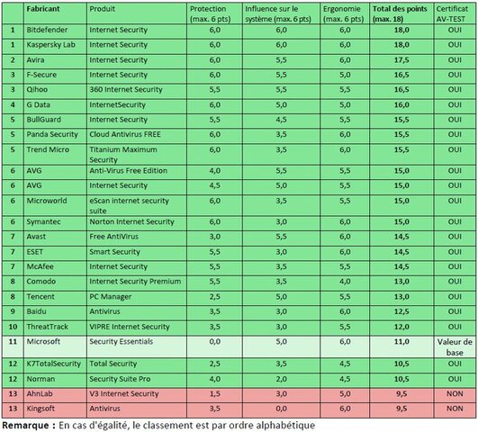 Avec une note maximale dans toutes les catégories et donc un total de 18/18, les suites de Bitdefender et Kaspersky Lab peuvent être fières d'elles. Le produit payant d'Avira suit juste derrière avec une note de 17,5/18.