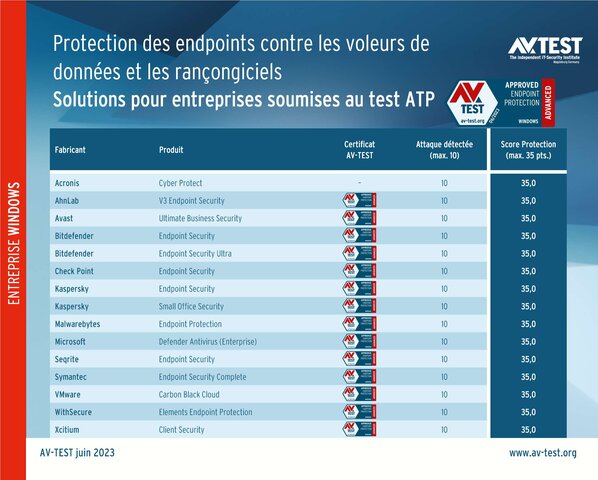 Au final, 26 produits sur les 27 testés obtiennent le score de protection maximal de 35 points au test Advanced Threat Protection réalisé en mai/juin 2023. Une vraie surprise à laquelle on ne s’attend pas forcément lors d’un test.