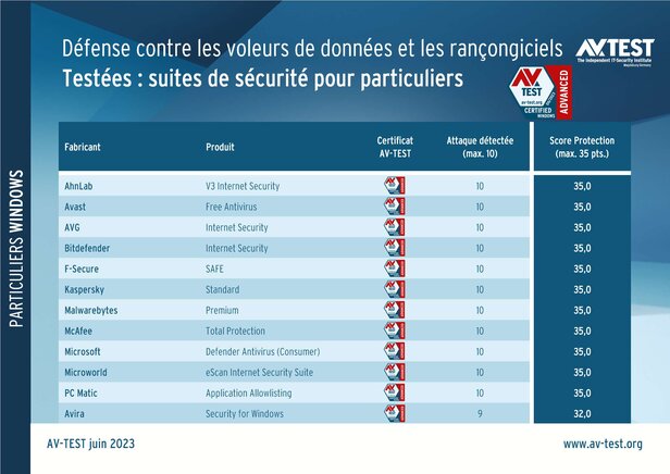 Une particularité dans ce test : le laboratoire attribue les points lorsque les suites de sécurité détectent les étapes d’attaque marquantes. Cela représente 4 points pour les voleurs de données et 3 points pour les rançongiciels. Pour ce test, le score de protection maximal est donc de 35 points (5 x 4 points + 5 x 3 points).