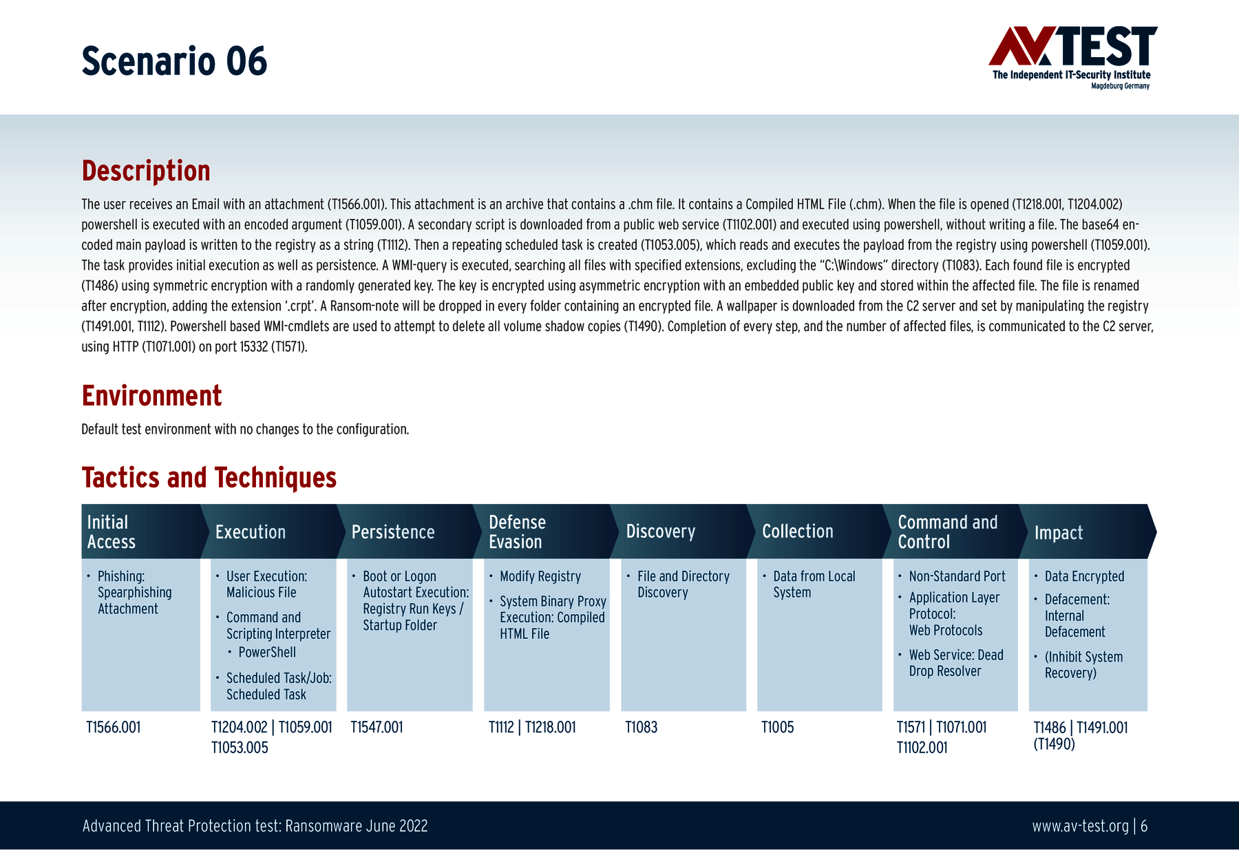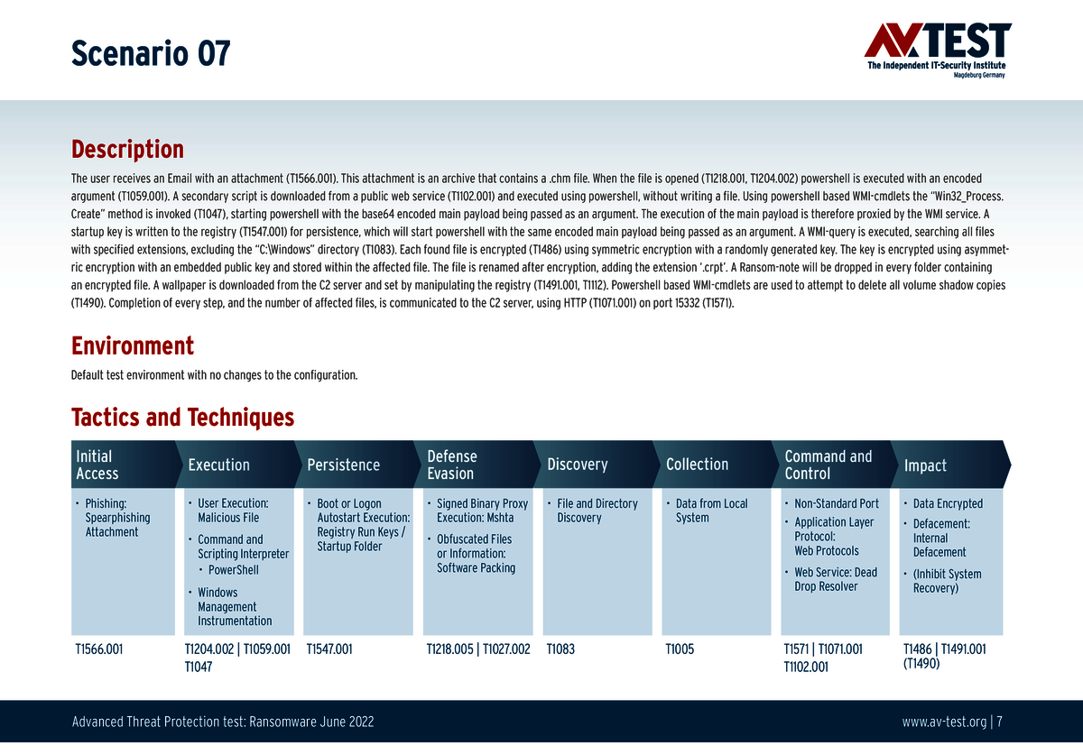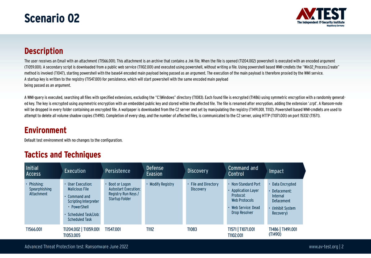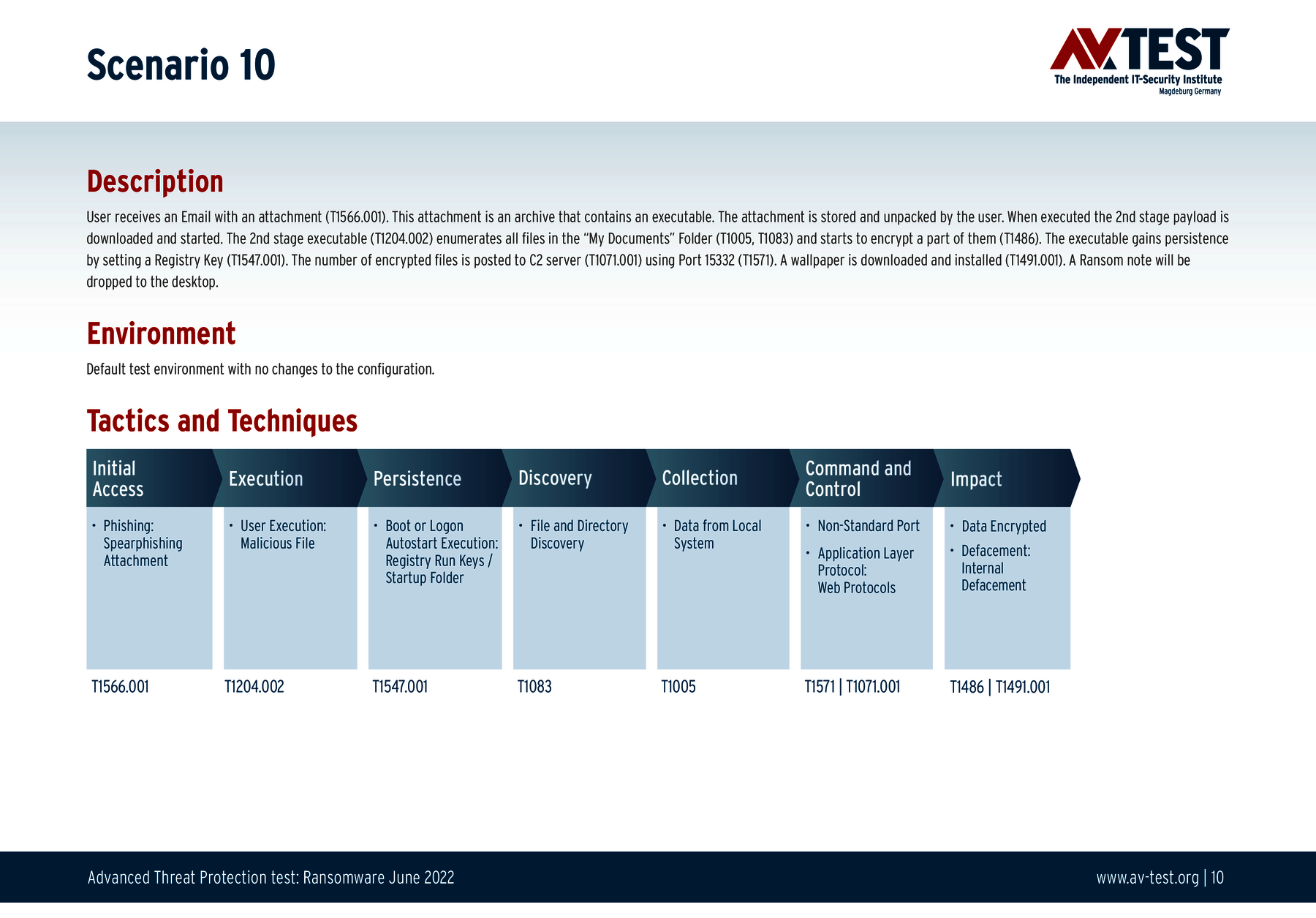 Chacun des 10 scénarios du test est défini et décrit de manière technique et précise dans les graphiques ci-dessous. Par exemple, une attaque est précédée d’un harponnage avec une pièce jointe à un e-mail. Le fichier contenu dans la pièce jointe est exécuté et commence en effet à attaquer et à crypter le système. Toutes les étapes du scénario indiquées dans les graphiques sont spécifiées par les codes « Techniques » de MITRE ATT&CK et utilisées par le laboratoire. Ainsi, le scénario est donc parfaitement compréhensible, même pour les spécialistes. Pour les lecteurs intéressés, le laboratoire explique les étapes techniques d’un test Advanced Threat Protection dans l’article déjà publié : Nouvelles défenses :des solutions EPP et EDR contre les attaques ATP et les rançongiciels sur le banc d'essai.