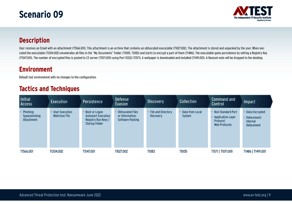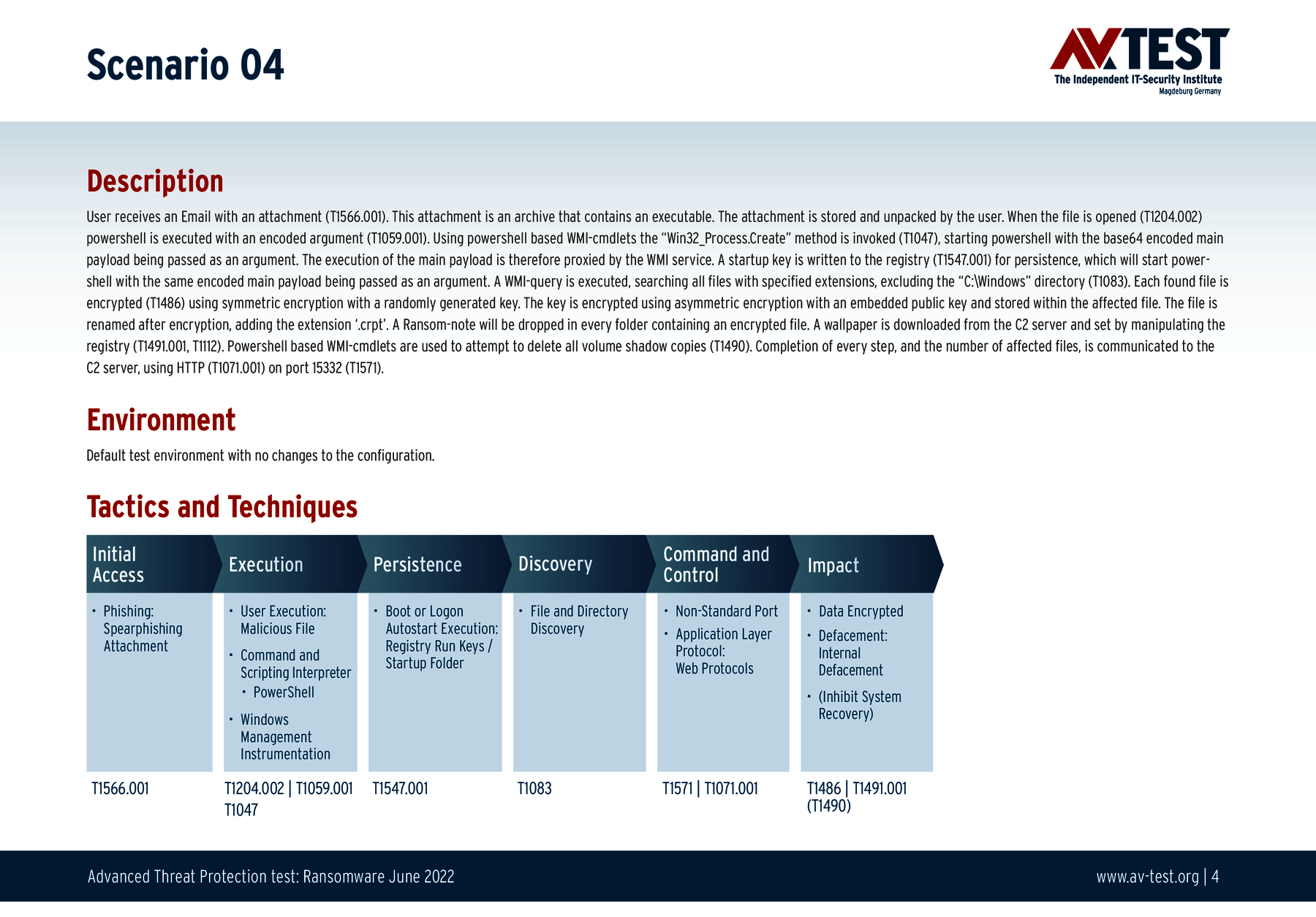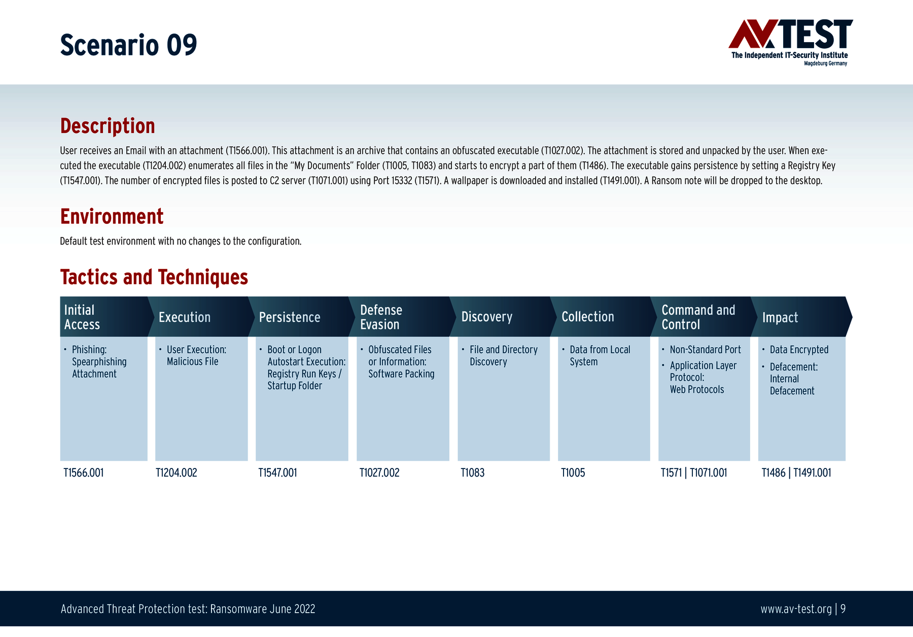 Chacun des 10 scénarios du test est défini et décrit de manière technique et précise dans les graphiques ci-dessous. Par exemple, une attaque est précédée d’un harponnage avec une pièce jointe à un e-mail. Le fichier contenu dans la pièce jointe est exécuté et commence en effet à attaquer et à crypter le système. Toutes les étapes du scénario indiquées dans les graphiques sont spécifiées par les codes « Techniques » de MITRE ATT&CK et utilisées par le laboratoire. Ainsi, le scénario est donc parfaitement compréhensible, même pour les spécialistes. Pour les lecteurs intéressés, le laboratoire explique les étapes techniques d’un test Advanced Threat Protection dans l’article déjà publié : Nouvelles défenses :des solutions EPP et EDR contre les attaques ATP et les rançongiciels sur le banc d'essai.